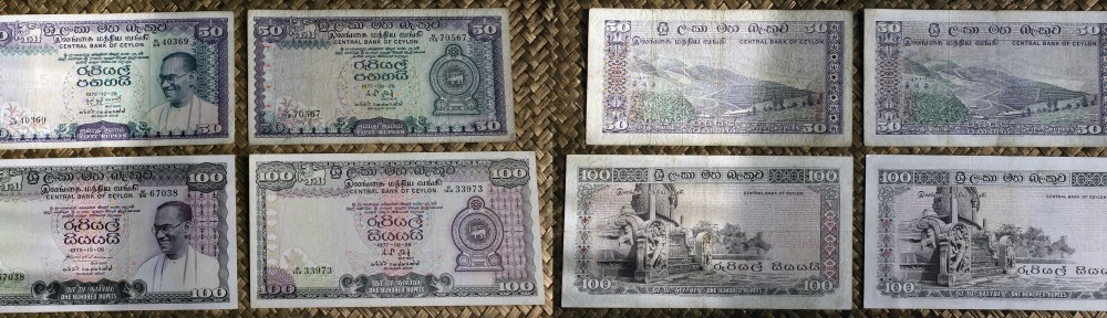 Contemplaremos en nuestra semejanza dos parejas de billetes cuya particularidad de emisión los data antes y después del cambio del nombre del país de Ceilán a Sri Lanka. Compararemos los ejemplares de 50 y 100 rupias del Central Bank of Ceylon de las series de 1971 y de 1977. Revisemos los billetes de 50 rupias de Ceilán de 1972, 100 rupias de Ceilán de 1975, 50 rupias de Sri Lanka de 1977 y 100 rupias de Sri Lanka de 1977.