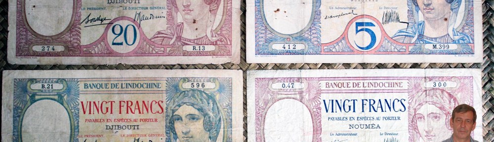 Contemplaremos francos emitidos para Djibouti (o Somalilandia francesa), piastras emitidas para Indochina (en la actualidad el territorio ocupado por Camboya, Vietnam y Laos) y francos emitidos para Nueva Caledonia. Todos comparten un diseño común; de hecho sus viñetas y composiciones solo cambian coloraciones, textos y moneda, siendo todos los ejemplares revisados emisiones que circularían en los años ’30 del pasado siglo.