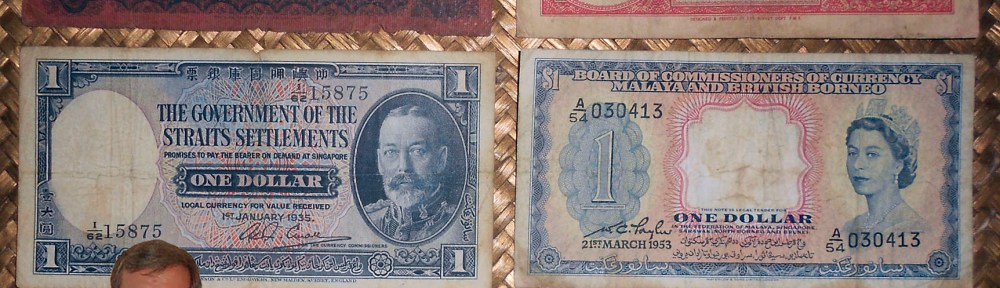 En orden cronológico comenzamos con los Straits Settlements o Asentamientos del Estrecho, de los que revisamos el billete de 1 dólar de 1921 y el ejemplar de 1 dólar de 1935. Estos territorios fueron una cesión de la Compañía Británica de las Indias Orientales en 1867 para su administración por el gobierno británico. Abarcaban los asentamientos de Malaca, Penang, Dinding y Singapur, pequeñas porciones territoriales de la península de Malaca (actual Malasia) inconexas entre ellas y rodeadas del resto de estados que pronto formarían la Unión Malaya. Con capital en Singapur, los Straits Settlements fueron disueltos en 1946, tras la ocupación japonesa y la creación de la Unión Malaya, que iba a incluir tanto sus territorios como el resto de estados de la península malaya.