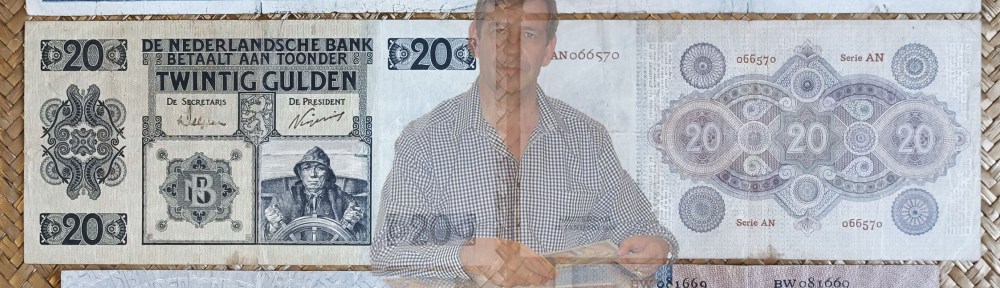 El billete de 20 florines de Holanda de 1926 nos ofrece como viñeta principal un primer plano de un marinero al timón en plena navegación, con algún velero a lo lejos. A la izquierda de su dibujo el logo del banco con las letras superpuestas NB en una roseta muy barroca. Al centro del anverso el escudo de armas de Países Bajos (un león rampante con una espada y un manojo de flechas en sus garras). Cuatro rosetones tipo cartela con el valor del billete en las respectivas esquinas y una artística figura con cuatro caballitos de mar en simetría radial completan este bello anverso. Cromaticidad con fondo amarillo verdoso, leyendas en negro y grabados en tonos azules.