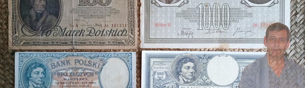 Contemplamos los billetes de 100 y 1.000 marek de Polonia de 1919 y los ejemplares de 100 y 500 zlotych de Polonia de 1924. Todos ellos ofrecen como grabado principal la cabeza y torso de Tadeusz Kosciuszko, general polaco y líder militar en Polonia, Lituania y Estados Unidos. Los billetes emitidos en marek (marcos) son del Polska Krajowa Kasa Pożyczkowa (PKKP), o Fondo Nacional de Préstamos de Polonia, que sería el banco emisor entre 1919 y 1924. Ese mismo año el Bank Polski o Banco de Polonia autorizaría el cambio de moneda a zlotych, emitiendo tanto monedas como billetes, que quedaron en reserva hasta la Reforma monetaria de Wladyslaw Grabski en 1924. Los ejemplares de 100 y 500 zlotych que vemos pertenecen a esa emisión de reserva.