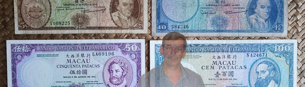 Vamos a revisar billetes emitidos por el Banco Nacional Ultramarino para uso en Macao en los años ’60 -’80 del pasado siglo. Contemplamos los billetes de Macao de 5 patacas de 1968, de 10 patacas de 1963, de 50 patacas de 1981 y de 100 patacas de 1984. Fueron impresos por la empresa londinense Bradbury, Wilkinson & Co.