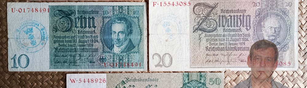 Los billetes de 10 y 20 reichsmark de 1929 y 50 reichmark de 1933 de la República de Weimar son austeros en sus diseños y casi monocromáticos por valores. Nos presentan personajes célebres en sus anversos: el billete de 10 mark de 1929 muestra a Albretch Daniel Thaer (agrónomo alemán del s. XVIII), en el billete de 20 mark de 1929 vemos a Werner von Siemens (inventor electrotécnico alemán del s. XIX cuyo apellido aún mantiene un gran imperio industrial), el billete de 50 mark de 1933 muestra a David Hansemann (banquero y político prusiano del s. XVIII). Números de serie por duplicado y en tipografía roja en anversos y reversos. Llevan un sello en seco de la entidad de control y repetidos sellos ovalados concéntricos con valor de cada ejemplar, también mediante troquel seco.