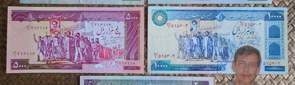 El billete de 5.000 rials de Irán de 1983-93 nos muestra en su anverso una marcha multitudinaria con los mullahs al frente y consignas en pancartas sobre la libertad, la independencia y con el retrato del ayatolá Jomeini. Estas manifestaciones se siguen celebrando para conmemorar el aniversario de la Revolución el 22 de Bahman, o undécimo mes del calendario iraní, que viene a corresponder con el 11 de febrero para el calendario gregoriano. A la derecha dos finas columnas con capiteles clásicos envuelven un entramado de bandas de cicloides y al pie central una figurada paloma posa en una rama con hojas y flores. Lleva las firmas de Mohsen Noorbakhsh como Director General y Hossein Namazi como Ministro de Finanzas. Cromaticidad predominante de rosados, marrones y púrpuras.