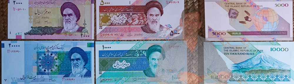 El ejemplar de 20.000 rials de Irán de 2005, de cromaticidad predominante de verdes y azules, nos ofrece al anverso el retrato de Jomeini sobre un frontal de arabescos y una artística roseta estrellada al centro. Lleva las firmas de Ebrahim Sheibani como Director General y Davood Danesh Jafaari como Ministro de Finanzas.