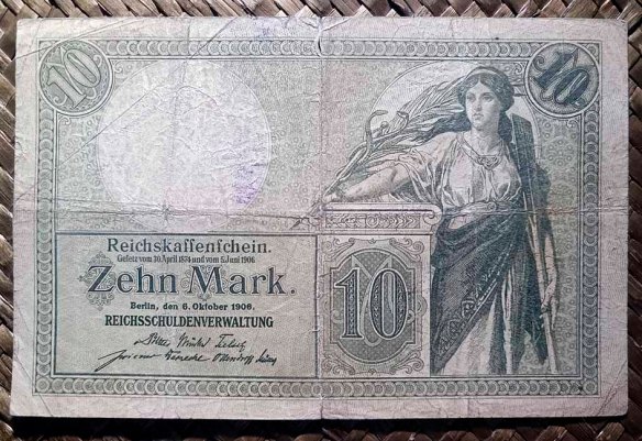 El billete del Tesoro Imperial de 10 marcos de 1906, en cromaticidad predominante en verde ceniza sobre papel con marca de agua, nos ofrece al anverso un grabado con una figura femenina de pie apoyada sobre un pedestal clásico y sosteniendo en sus brazos una vara de Esculapio, una rama de palma y un remo, alegorías de la Medicina, la Agricultura y la Navegación. Diseño de Friedrich Paul Thumann  y edición de la Imprenta Imperial de Berlín. Este sería el primer billete alemán que iba a mostrar marca de agua en su soporte papel (su marca de agua nos muestra la cabeza clásica del dios Mercurio/Hermes).