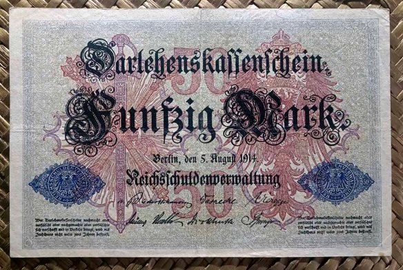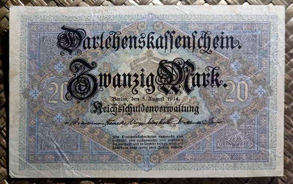 Cuando la escasez de cambio pequeño se hizo especialmente presente durante las primeras semanas de la guerra, el Consejo Federal decidió producir también billetes de préstamo en denominaciones de 1 y 2 marcos, que repetiría en varias ediciones junto a nuevos diseños de 5 y 20 marcos durante el periodo entre 1914 y 1920 (…pero estos los veremos en un próximo artículo).
