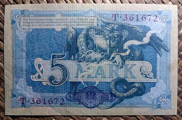 El billete del Tesoro Imperial de 5 marcos de 1904, de cromaticidad predominante en tonos azules sobre papel filigranado, nos ofrece al anverso un grabado de una figura femenina, alegoría de Germania, sedente junto al mar y rodeada de símbolos de Poder, del Comercio, la Industria, la Navegación y la Agricultura (escudo y estandarte, maza, engranaje, barco, gavilla de mies, racimos de frutas,…). Junto a ella un niño sostiene a la paloma de la libertad. Diseño de Alexander Zick y edición de la Imprenta Imperial de Berlín.