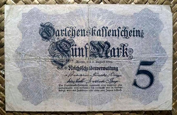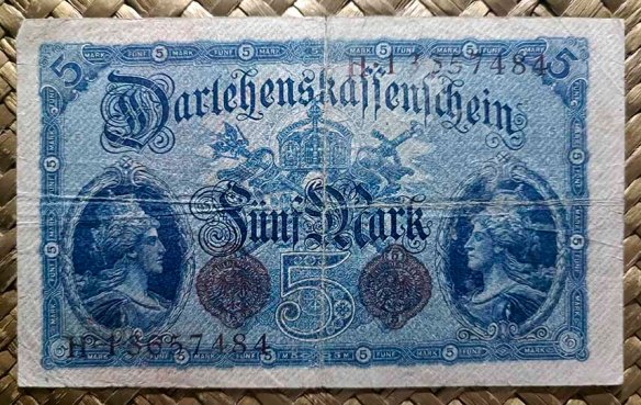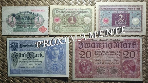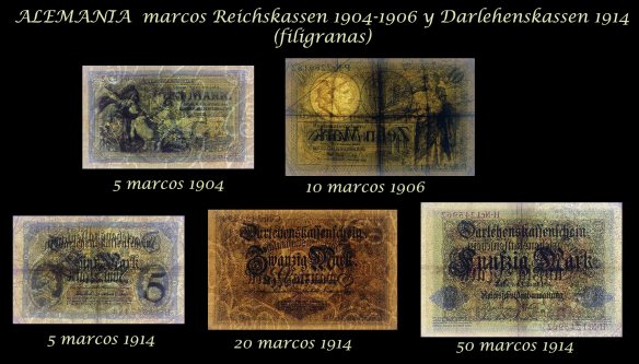 Vamos a revisar los dos primeros billetes del Tesoro del Reich (Reichskassenschein) emitidos en el siglo XX y los tres billetes de la primera emisión de Certificados de Prestamo (Darlehenskassenschein) de 1914. Contemplamos los ejemplares de Alemania de 5 marcos de 1904 y 10 marcos de 1906 (Reichskassen) y de 5, 20 y 50 marcos de 1914 (Darlehenskassen).