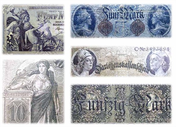 Todos los billetes mostrados se imprimen sobre papel filigranado, aunque el ejemplar del Tesoro de 10 marcos de 1906 introduce el uso de marca de agua con figura alegórica clásica en el billetario alemán.