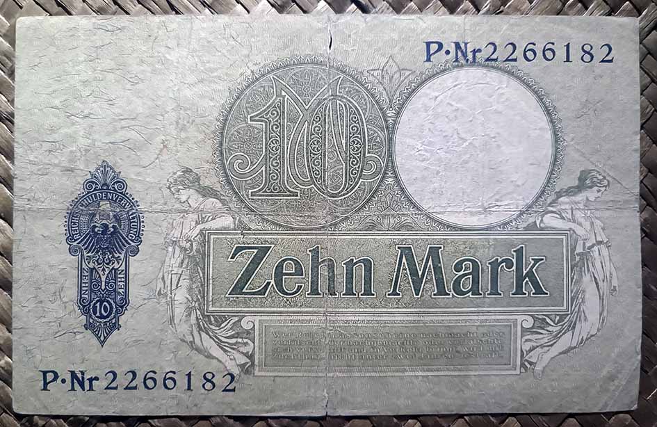 El billete del Tesoro Imperial de 10 marcos de 1906, en cromaticidad predominante en verde ceniza sobre papel con marca de agua, nos ofrece al anverso un grabado con una figura femenina de pie apoyada sobre un pedestal clásico y sosteniendo en sus brazos una vara de Esculapio, una rama de palma y un remo, alegorías de la Medicina, la Agricultura y la Navegación. Diseño de Friedrich Paul Thumann  y edición de la Imprenta Imperial de Berlín. Este sería el primer billete alemán que iba a mostrar marca de agua en su soporte papel (su marca de agua nos muestra la cabeza clásica del dios Mercurio/Hermes).