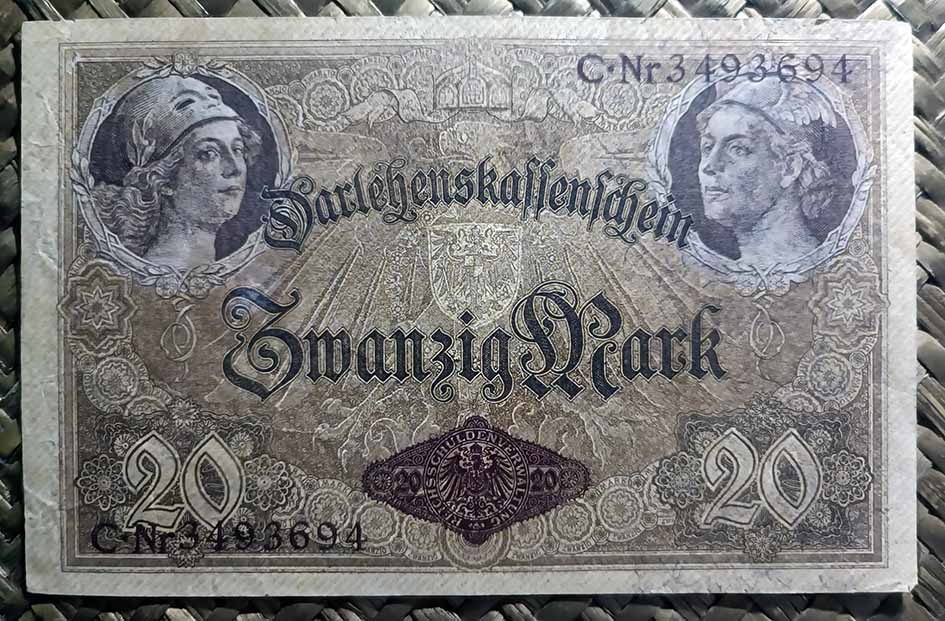 De modo que en las dos primeras décadas del s.XX coexistirían billetes de bancos privados y billetes del Estado (Reichsbanknoten),  junto a billetes del Tesoro del Reich (Reichskassenscheine) y billetes/vales certificados de préstamo (Darlehenskassenscheine). Tras la Primera Guerra Mundial el sistema monetario entró en un caos creciente hasta colapsar completamente en medio de una inflación galopante. Paralelamente aparecerían las emisiones territoriales de billetes de emergencia o Notgeld.