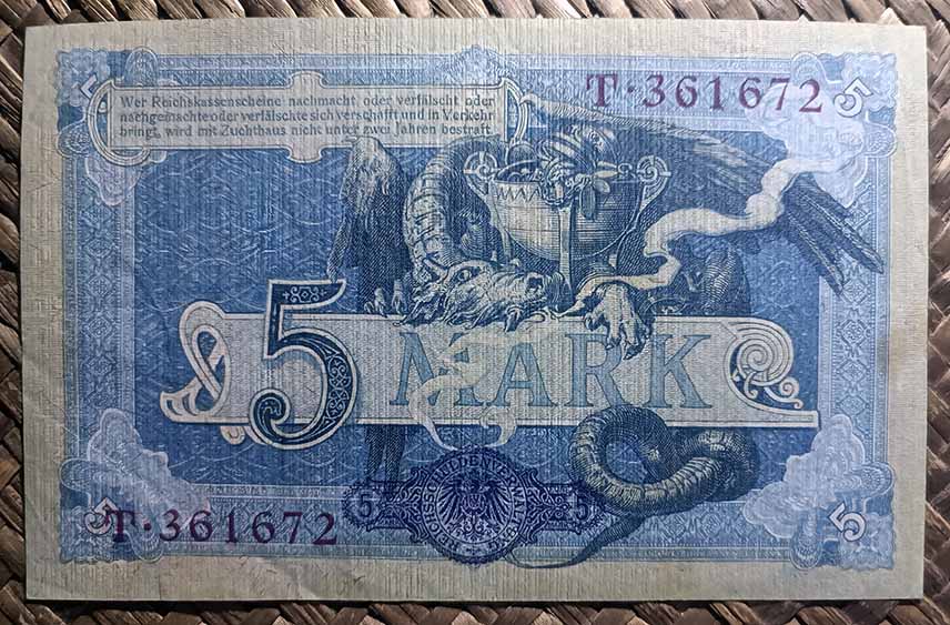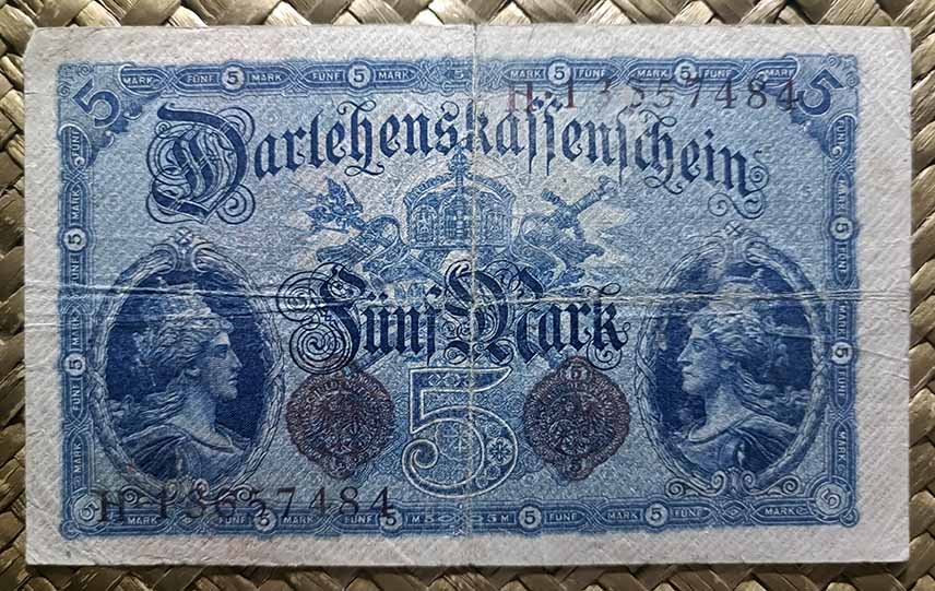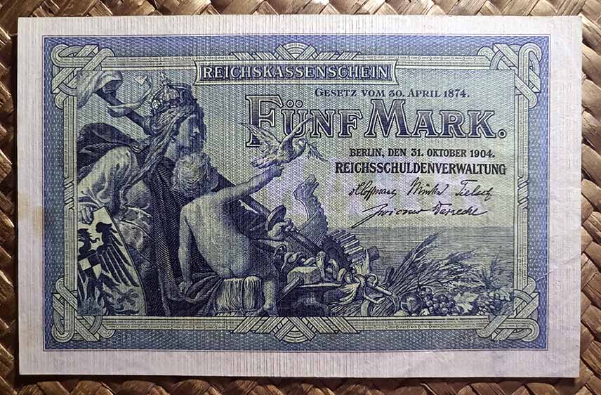 El billete del Tesoro Imperial de 5 marcos de 1904, de cromaticidad predominante en tonos azules sobre papel filigranado, nos ofrece al anverso un grabado de una figura femenina, alegoría de Germania, sedente junto al mar y rodeada de símbolos de Poder, del Comercio, la Industria, la Navegación y la Agricultura (escudo y estandarte, maza, engranaje, barco, gavilla de mies, racimos de frutas,…). Junto a ella un niño sostiene a la paloma de la libertad. Diseño de Alexander Zick y edición de la Imprenta Imperial de Berlín.