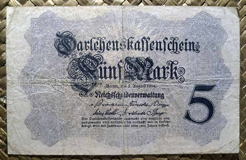 El billete Certificado de Préstamo de 5 marcos de 1914, en cromaticidad de fondo monocolor violeta claro, nos ofrece un marco barroco con una composición heráldica central como soporte de las leyendas en letras góticas y tinta negra (textos de tipo de emisión, valor y divisa, lugar y fecha, entidad emisora, firmas validadoras y narrativa de pena ante falsificación). En la esquina inferior derecha un gran número determina el valor fiduciario del ejemplar.