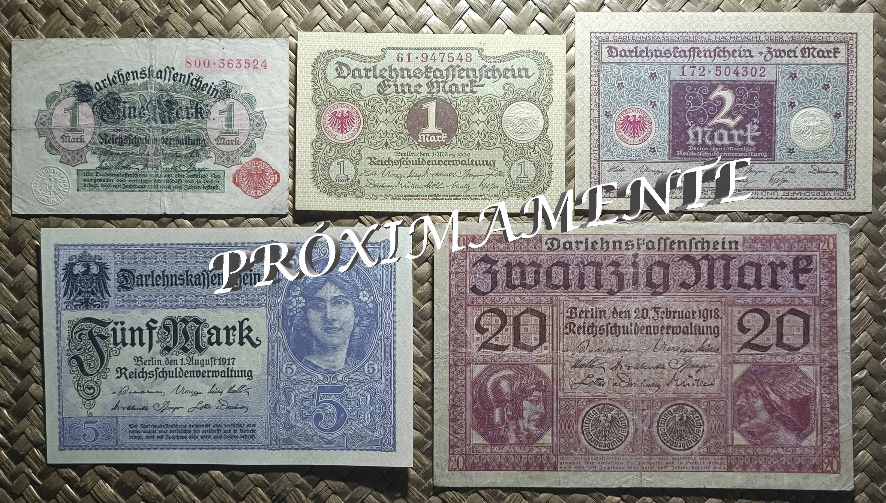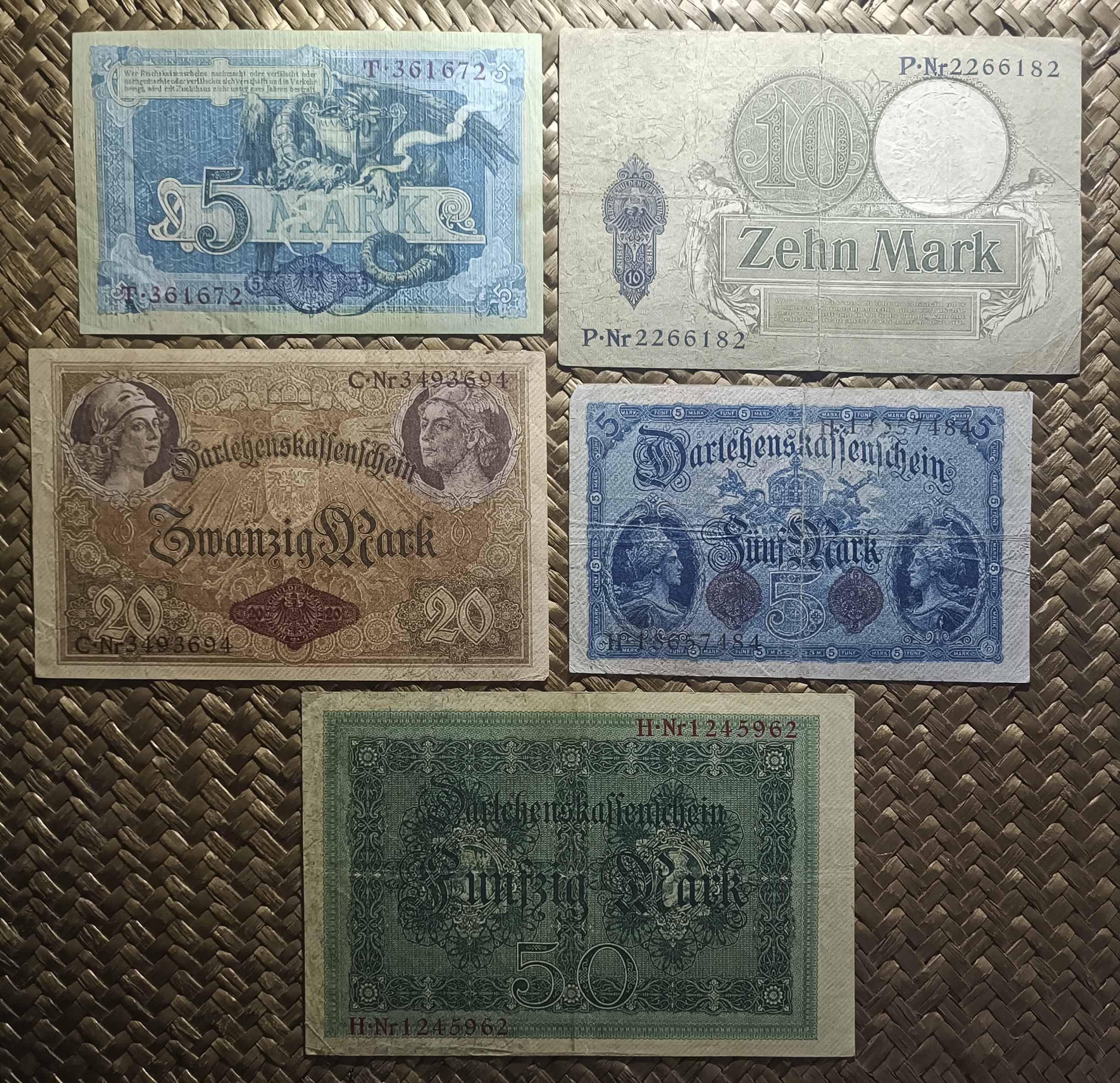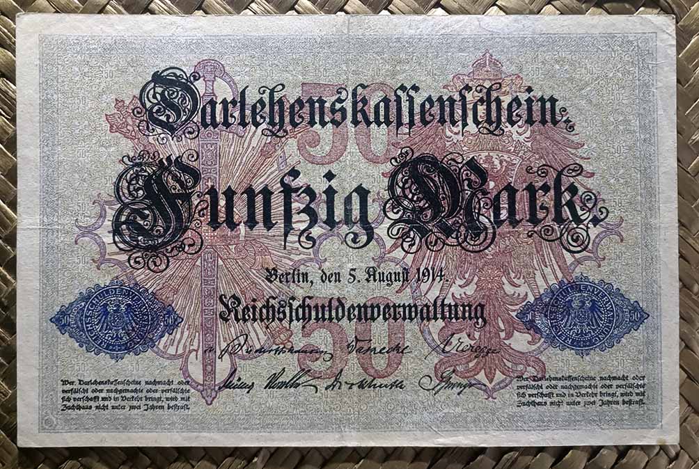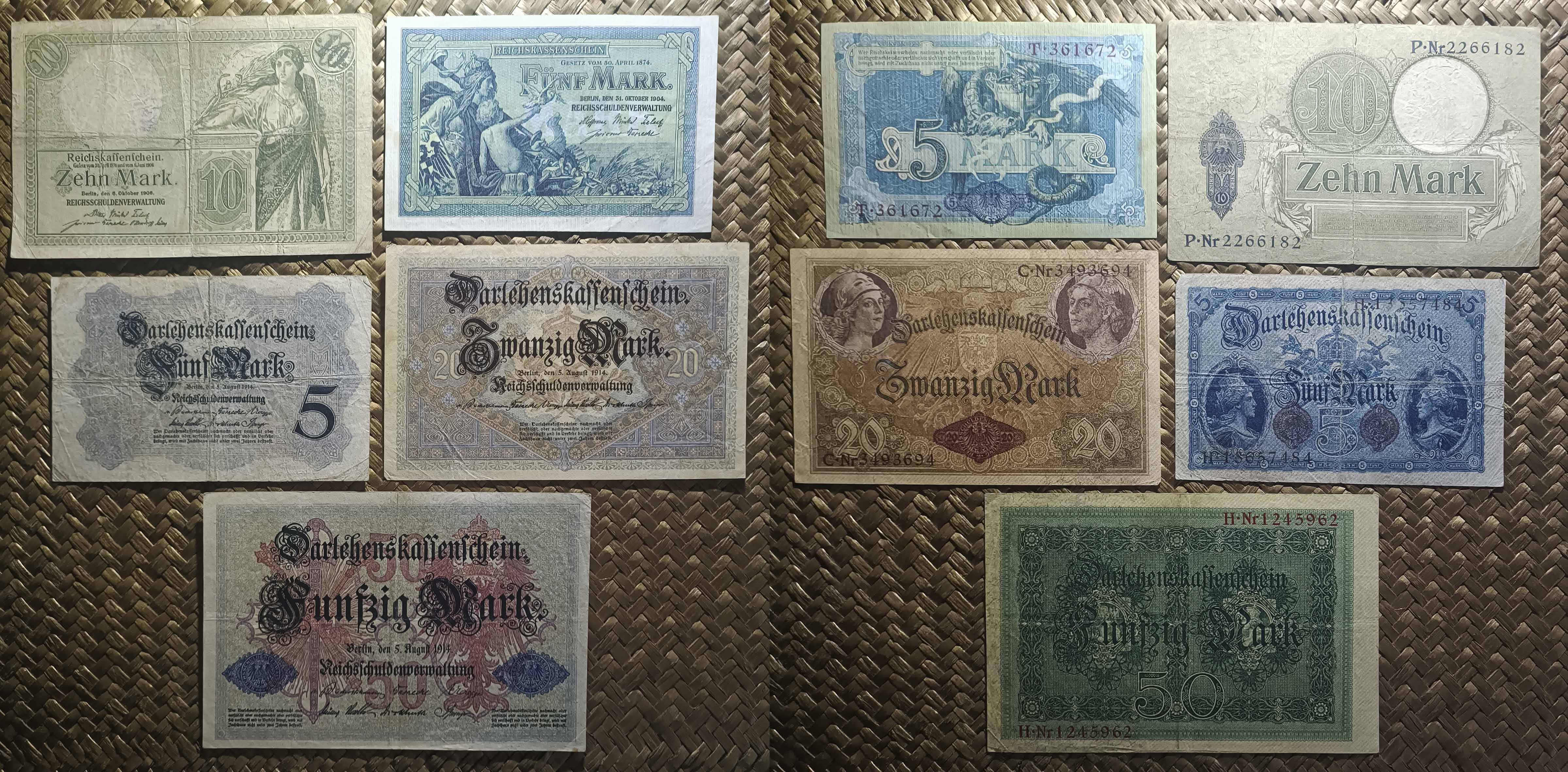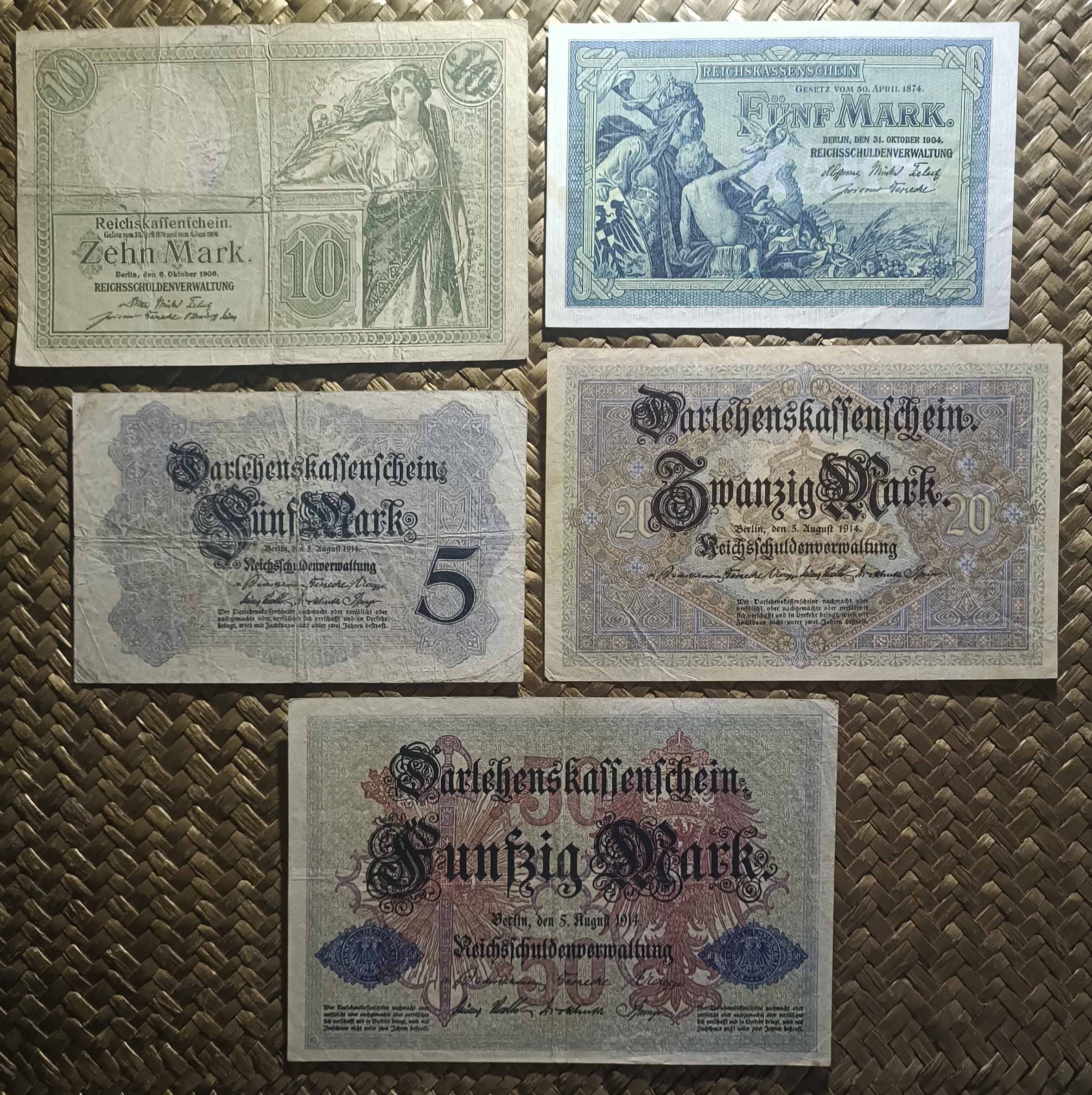 Vamos a revisar los dos primeros billetes del Tesoro del Reich (Reichskassenschein) emitidos en el siglo XX y los tres billetes de la primera emisión de Certificados de Prestamo (Darlehenskassenschein) de 1914. Contemplamos los ejemplares de Alemania de 5 marcos de 1904 y 10 marcos de 1906 (Reichskassen) y de 5, 20 y 50 marcos de 1914 (Darlehenskassen).