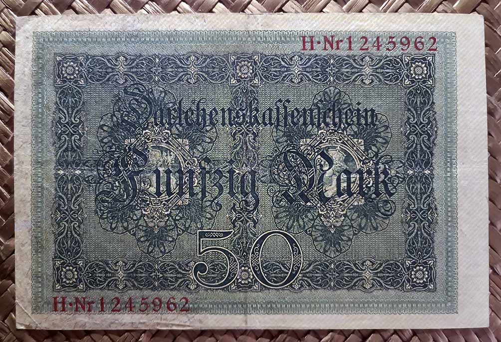 En los reversos aparecen en diagonal y por duplicado los números de serie en tipografías negra y roja, según valores. Se mantienen las alegorías como composiciones con diseños más pictóricos y libres de leyendas en los Reichskassenscheine y se ofrecen barrocas composiciones de fondo (orlas de rosetas para los marcos y heráldica al centro) y medallones en los lados con figuras clásicas o alegóricas para los Darlehenskassenscheine. En este lado aparacen unos sellos húmedos de la Administración de la Deuda Imperial (Reichsschuldenverwaltung), excepto para el ejemplar de 50 marcos de 1914 que los mostrará en el anverso.