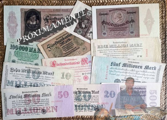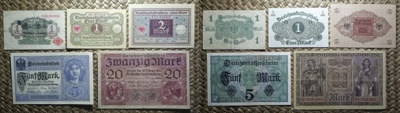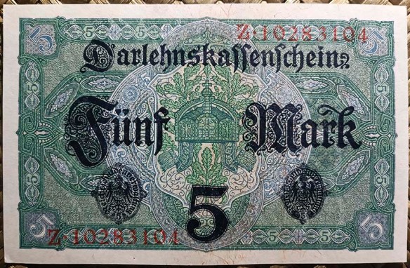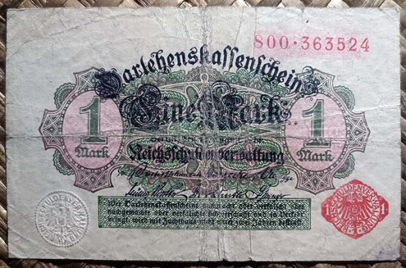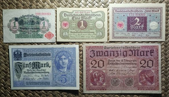 Durante la Primera Guerra Mundial, circularon billetes de valores coincidentes pero procedentes de diferentes entidades o designaciones, tanto Reichsbanknotes como Reichskassenscheine o Darlehenskassenscheine. Billetes del Banco, certificados de Deuda o Préstamo y billetes del Tesoro coexistirían como preludio de la incipiente inflación que estaba por llegar en apenas unos años, …pero esos los veremos en próximos post.