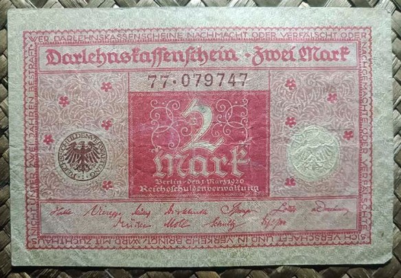 El ejemplar de Alemania de 1 marco Darlehenskassen de 1920 nos ofrece una impresión multicolor, abandonando temporalmente la austeridad cromática de las impresiones anteriores. Su anverso, en tonos verdes, marrones y sello rojo nos muestra una sencilla composición floral como viñeta, en la que sobresalen tres medallones en su centro horizontal, el de la izquierda con el sello del emisor (águila republicana), al centro un disco con la cifra de valor y su divisa y a la derecha nuevamente el sello del emisor estampado en seco. Las leyendas identificativas mantienen la tipografía de letra gótica en diferentes proporciones. Ya son once las firmas de administradores mostradas en este lado del ejemplar. En el centro superior un único número de serie en tipografía roja.