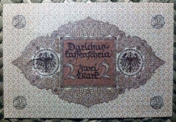 Por último, el ejemplar de Alemania de 2 marcos Darlehenskassen de 1920 (pk.60) fue una segunda edición del anterior con un sencillo cambio cromático. Se eliminaron los tonos azules, se cambiaron los tonos marrones por rosados y el sello del águila republicana pasó de color rojo a color marrón. Las leyendas también se cambiaron de marrones a rojas y el número de serie se tipografió en color marrón.