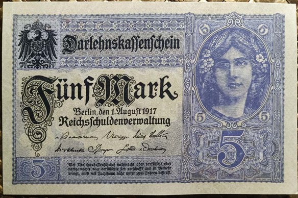 El ejemplar de Alemania de 5 marcos Darlehenskassen de 1917 de cromaticidad azul grisáceo sobre papel amarillo pálido, nos ofrece en su anverso el grabado del rostro de una joven idealizada, de aspecto soñador y cabello engalanado con flores y espigas. En la esquina superior izquierda el águila imperial coronada. El resto de viñeta sirve de base a las identidades en letras góticas (tipo de emisión, valor y moneda, lugar y fecha de emisión, entidad emisora y texto penal ante falsificación). Lo validan ocho firmas de administradores de la Deuda del Reich.
