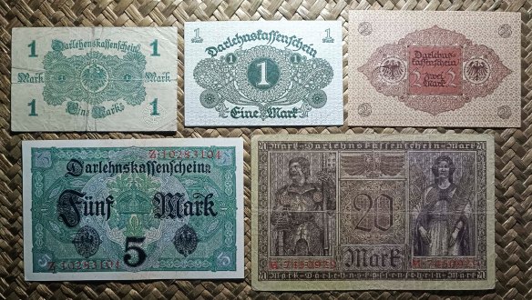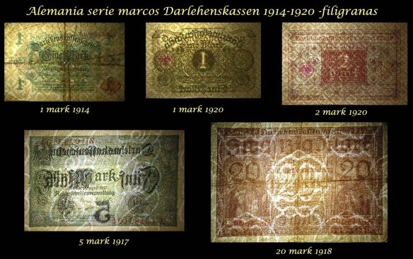 Revisaremos los billetes Darlehenskassenscheine de 1 marco de 1914, 1 y 2 marcos de 1920, 5 marcos de 1917 y 20 marcos de 1918, todos ellos emitidos como certificados de Deuda del Gobierno y ya con el territorio inmerso en plena 1ª Guerra Mundial.