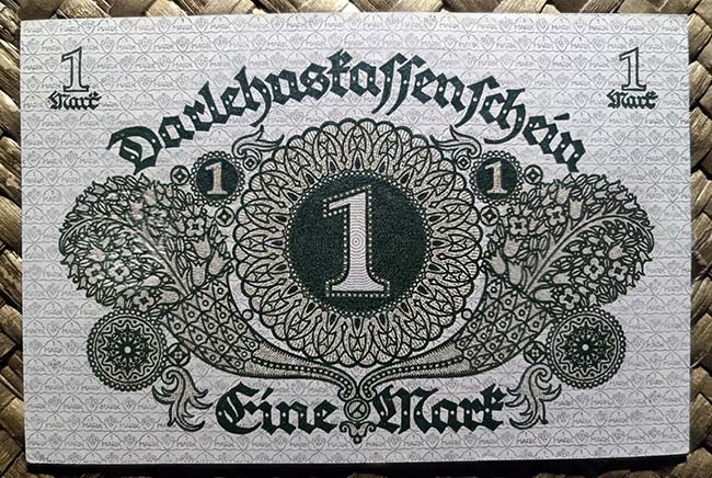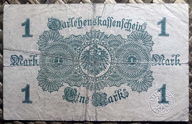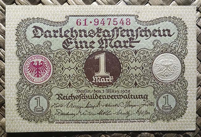 El ejemplar de Alemania de 1 marco Darlehenskassen de 1920 nos ofrece una impresión multicolor, abandonando temporalmente la austeridad cromática de las impresiones anteriores. Su anverso, en tonos verdes, marrones y sello rojo nos muestra una sencilla composición floral como viñeta, en la que sobresalen tres medallones en su centro horizontal, el de la izquierda con el sello del emisor (águila republicana), al centro un disco con la cifra de valor y su divisa y a la derecha nuevamente el sello del emisor estampado en seco. Las leyendas identificativas mantienen la tipografía de letra gótica en diferentes proporciones. Ya son once las firmas de administradores mostradas en este lado del ejemplar. En el centro superior un único número de serie en tipografía roja.