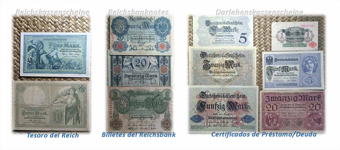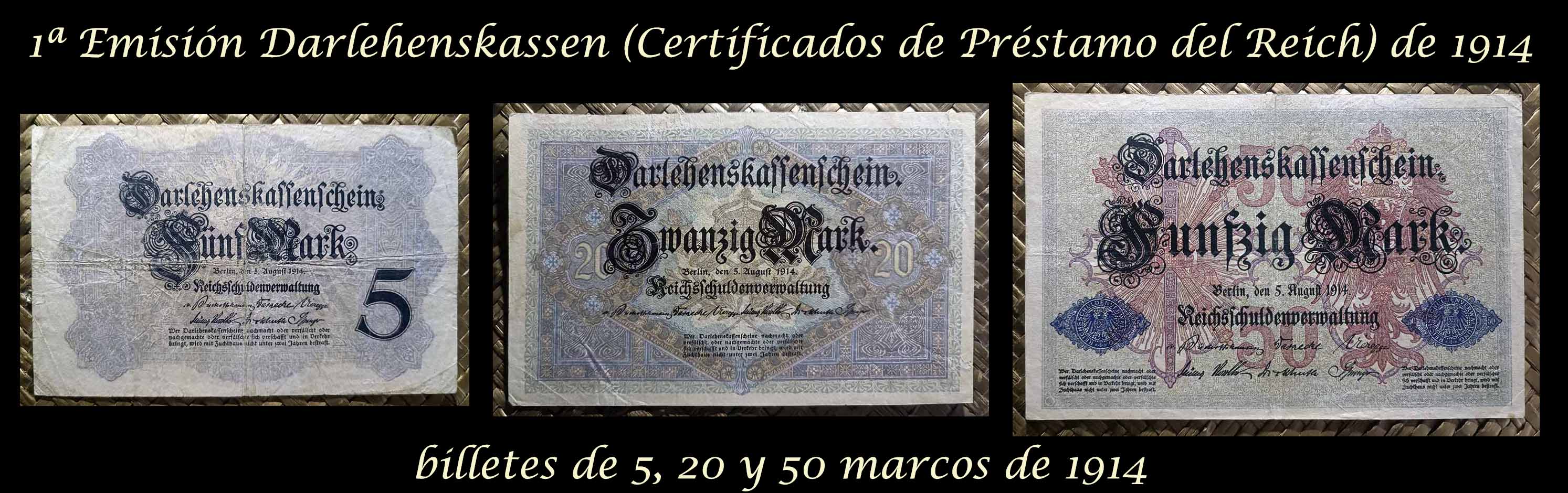 Durante la Primera Guerra Mundial, circularon billetes de valores coincidentes pero procedentes de diferentes entidades o designaciones, tanto Reichsbanknotes como Reichskassenscheine o Darlehenskassenscheine. Billetes del Banco, certificados de Deuda o Préstamo y billetes del Tesoro coexistirían como preludio de la incipiente inflación que estaba por llegar en apenas unos años, …pero esos los veremos en próximos post.