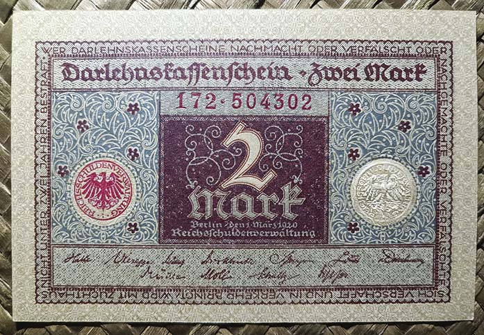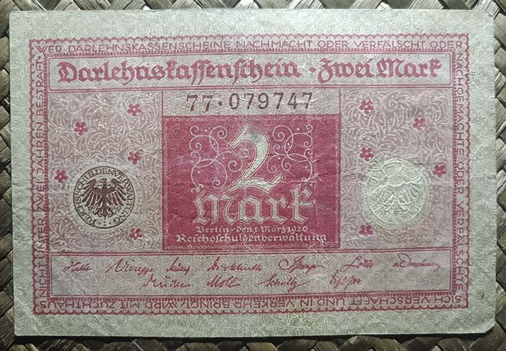 El billete de Alemania de 2 marcos Darlehenskassen de 1920 (pk.59) sigue las pautas del ejemplar anterior, un anverso multicolor, esta vez en tonos marrones, azules y sello rojo. Repite la composición, con sello del emisor al centro izquierda, panel cuadrado con valor en cifra y divisa al centro y sello del emisor de estampación en seco a la derecha. Número de serie rojo centrado arriba y leyendas identitarias góticas repartidas por la viñeta. Los validadores que firman la emisión siguen siendo once.