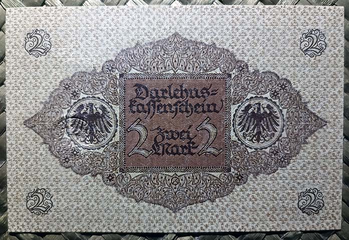 Por último, el ejemplar de Alemania de 2 marcos Darlehenskassen de 1920 (pk.60) fue una segunda edición del anterior con un sencillo cambio cromático. Se eliminaron los tonos azules, se cambiaron los tonos marrones por rosados y el sello del águila republicana pasó de color rojo a color marrón. Las leyendas también se cambiaron de marrones a rojas y el número de serie se tipografió en color marrón.