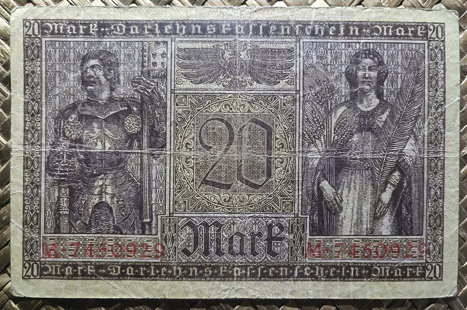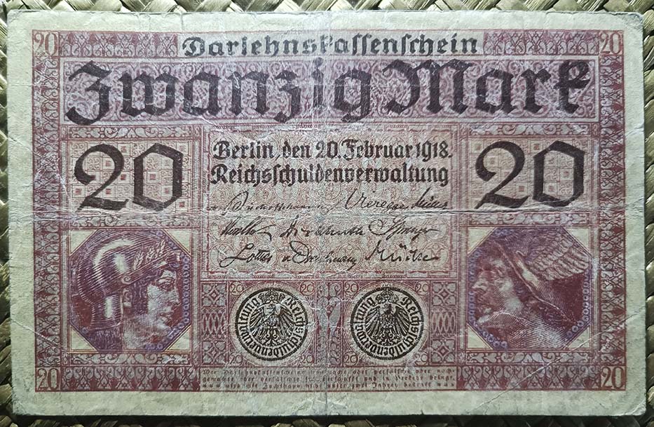 El billete de Alemania de 20 marcos Darlehenskassen de 1918 iba a ser el último emitido durante el conflicto bélico. En cromaticidad marrón rojiza, su anverso nos ofrece en los laterales a dos divinidades romanas: en la izquierda la cabeza de Minerva con casco (diosa de la Sabiduría, las Artes y la Guerra) y en la derecha la cabeza de Mercurio con casco alado (dios del Comercio y Mensajero de dioses). Junto a ellos, en la columna central, dos sellos impresos de la entidad emisora Reichsschuldenverwaltung con el águila imperial coronada. El resto de la viñeta se cubre con artísticos paneles rectangulares como base a los textos identitarios habituales de la emisión. La validación esta vez se contrasta con nueve firmas de administradores diferentes.
