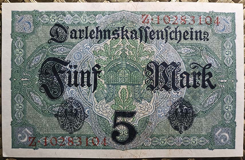 El ejemplar de Alemania de 5 marcos Darlehenskassen de 1917 de cromaticidad azul grisáceo sobre papel amarillo pálido, nos ofrece en su anverso el grabado del rostro de una joven idealizada, de aspecto soñador y cabello engalanado con flores y espigas. En la esquina superior izquierda el águila imperial coronada. El resto de viñeta sirve de base a las identidades en letras góticas (tipo de emisión, valor y moneda, lugar y fecha de emisión, entidad emisora y texto penal ante falsificación). Lo validan ocho firmas de administradores de la Deuda del Reich.