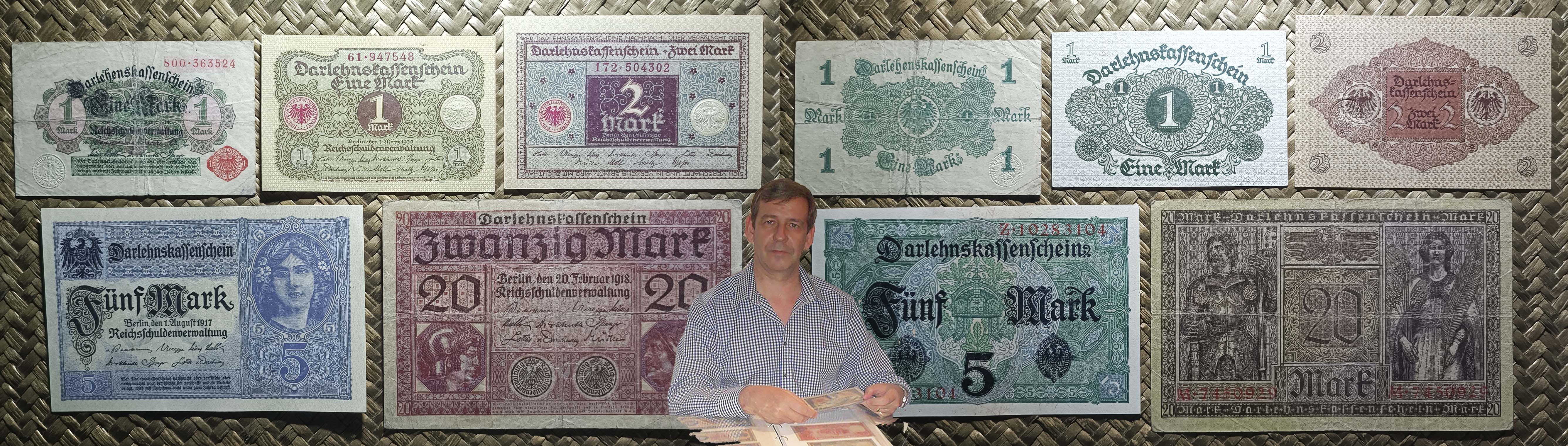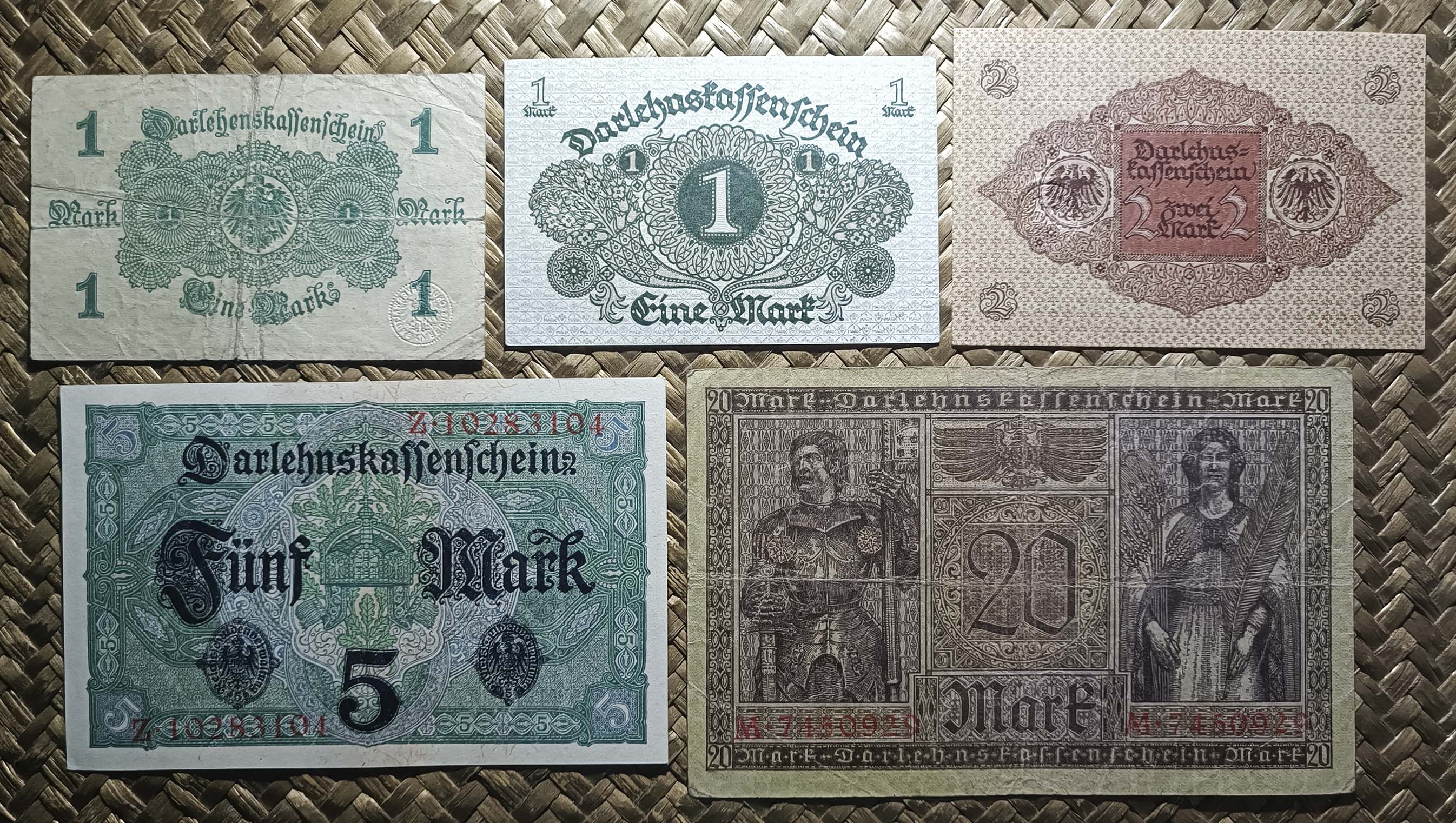 Revisaremos los billetes Darlehenskassenscheine de 1 marco de 1914, 1 y 2 marcos de 1920, 5 marcos de 1917 y 20 marcos de 1918, todos ellos emitidos como certificados de Deuda del Gobierno y ya con el territorio inmerso en plena 1ª Guerra Mundial.