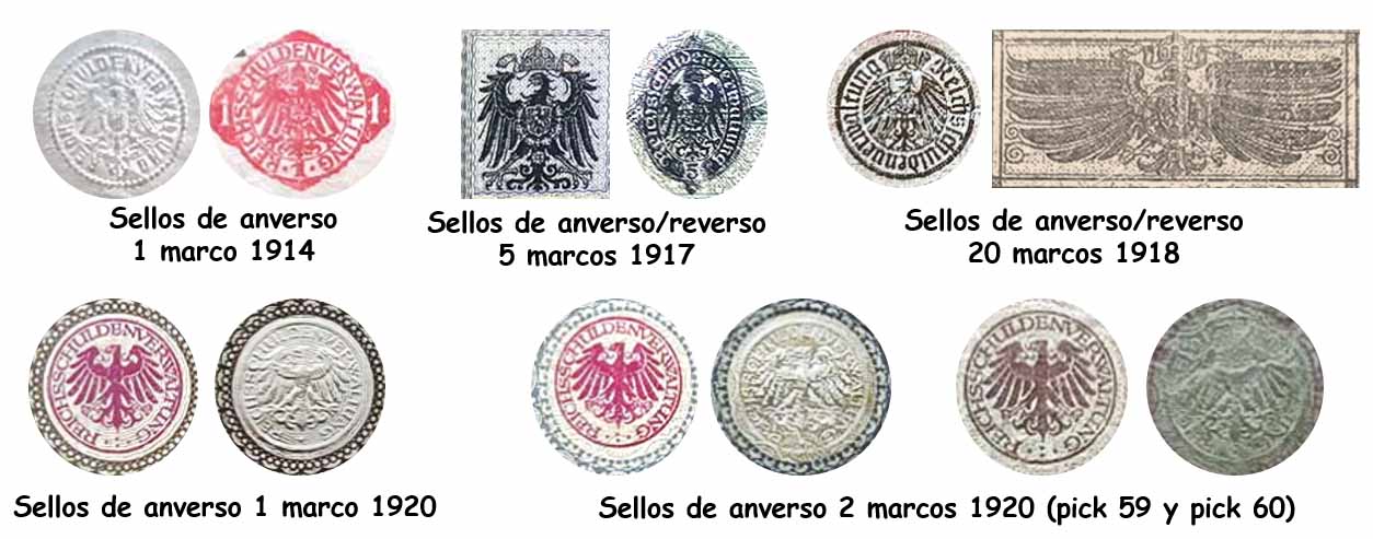 En todos los ejemplares revisados veremos la inclusión de sellos identificativos de la entidad emisora, la Administración de la Deuda del Reich o Reichsschuldenverwaltung, tanto en la etapa imperial como en la de la República de Weimar ya después de la finalización de la guerra. Se pueden contemplar sellos en seco o impresos (en los billetes de 1 y 2 marcos) o sellos impresos o formando parte de los grabados (en los valores de 5 y 20 marcos). La diferencia significativa entre ellos depende de la fecha de edición, y consecuentemente del gobierno coetáneo; así comprobaremos en las emisiones entre 1914 y 1918 (época imperial) cómo el águila heráldica que preside el sello lleva la corona imperial sobre su cabeza, y cómo este detalle es eliminado sobre el águila de los billetes de 1920, ya republicanos.
