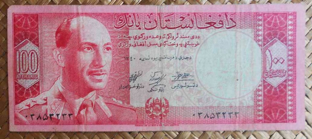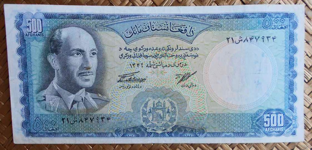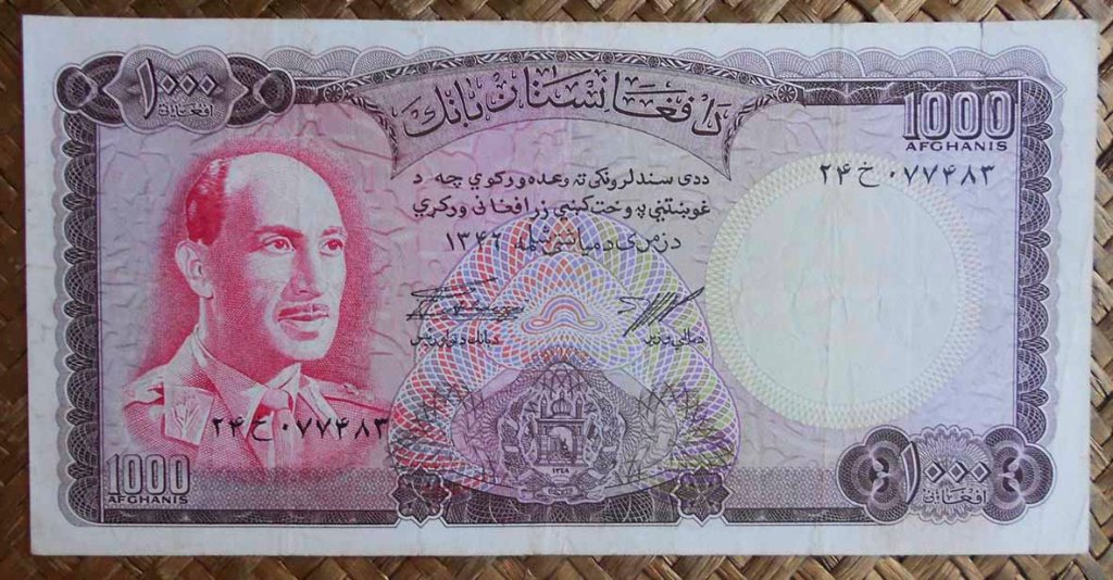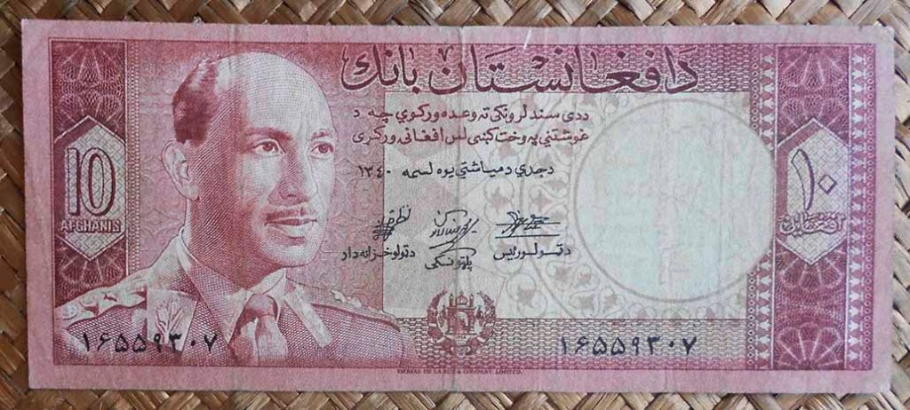 La serie de billetes que vamos a revisar está presidida por el personaje que ejerció el reinado más longevo del Afganistán de épocas recientes, el rey Mohammed Zahir Shah, tanto en la serie de afganis de 1961 como en la emitida en 1967. Contemplamos los ejemplares de 10, 20 y 100 afganis de Afganistán de 1961 y los billetes de 50, 100, 500 y 1.000 afganis de Afganistán de 1967. Fueron impresos por la empresa inglesa Thomas De La Rue & Co. Ltd.