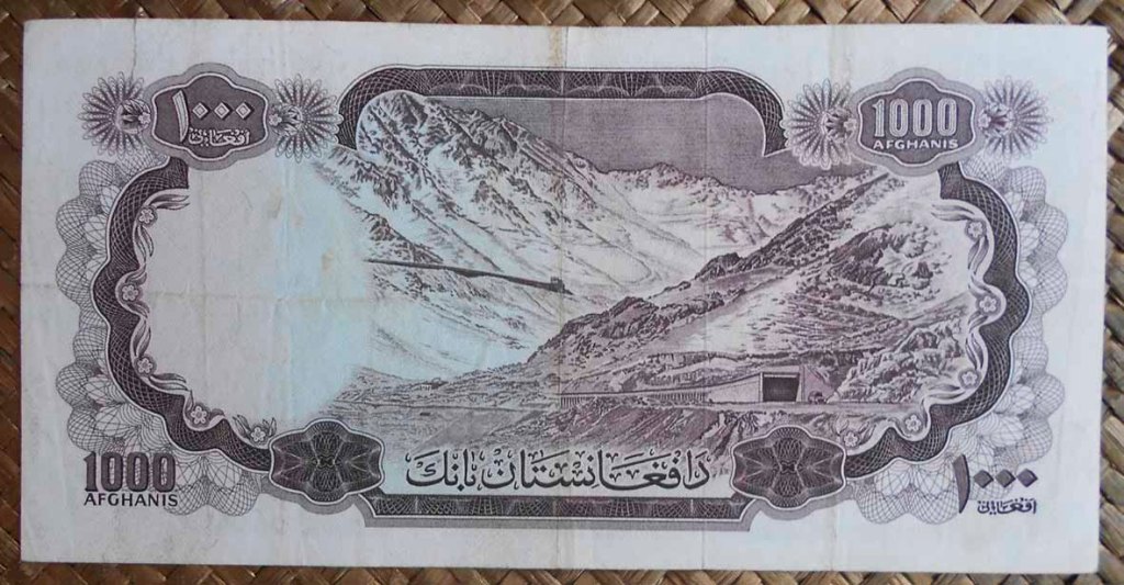 El billete de 1.000 afganis de Afganistán de 1967 mantiene al rey Zahir Shah presidiendo el anverso y nos muestra al reverso un paisaje montañoso bordeado por una carretera y túneles en sus laderas. Cromaticidad predominante marrón, destacando el retrato del rey en el anverso en tonos rosas.