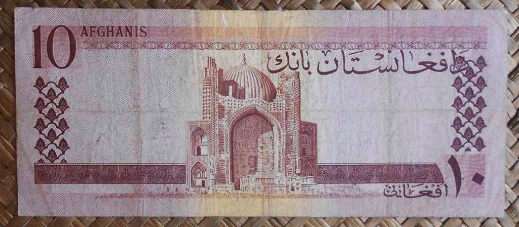 El billete de 10 afganis de Afganistán de 1961 nos ofrece al rey Zahir Shah en anverso y la mezquita de Khwaja Mohammad Abu-Nasr Parsa (1460-1598) en Bactra (norte del país), también conocida como Masjid Sabz o Mezquita Verde. De coloración predominante marrón púrpura.