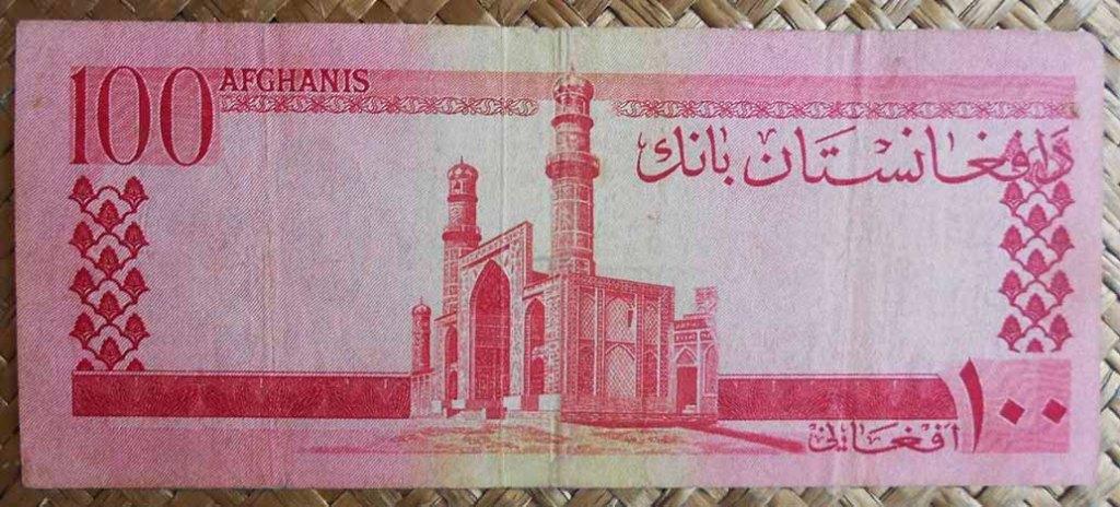 El billete de 100 afganis de Afganistán de 1961 está presidido al anverso por Zahir Shah y nos ofrece en el reverso una vista de la Mezquita del Viernes de Herat, concretamente su arco principal (o pishtak) y las dos torres o minaretes de sus lados. Cromaticidad rosácea en ambos lados.