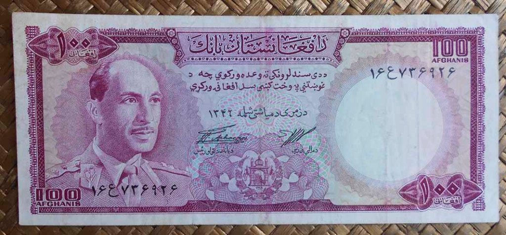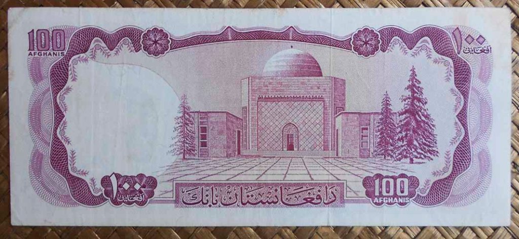 El billete de 100 afganis de Afganistán de 1967 nos ofrece al rey Zahir en el anverso y nos guarda para el reverso la imagen del Mausoleo del rey Nadir Shah Ghazi (padre de Zahir Shah) en Kabul. Cromaticidad predominante púrpura en ambos lados.