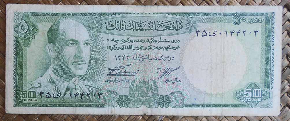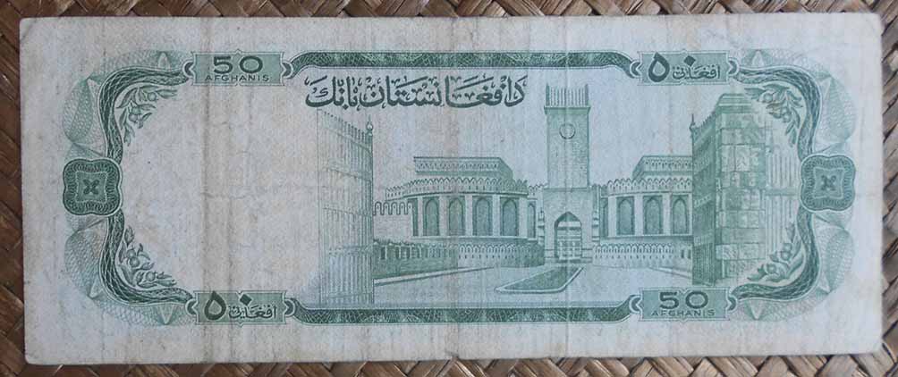 El billete de 50 afganis de Afganistán de 1967 nos ofrece al anverso al rey Mohammed Zahir y al reverso las edificaciones de Arg-e-Shahi o Cuidadela del rey, construida a finales del s.XIX por el rey Abdul Rahman Khan. Son la sede actual del Presidente Ashraf Ghani y su séquito de asesores en la capital Kabul. Cromaticidad predominante en tonos verdes.