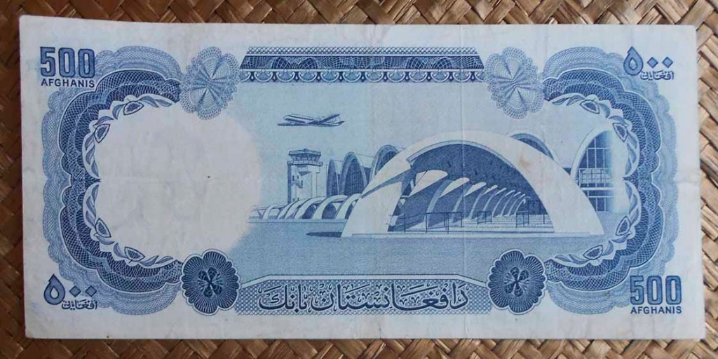 El billete de 500 afganis de Afganistán de 1967 nos ofrece al anverso al rey Zahir Shah y en el reverso una vista del aeropuerto de Kandahar, en el sur afgano. De cromaticidad predominante azul zafiro.