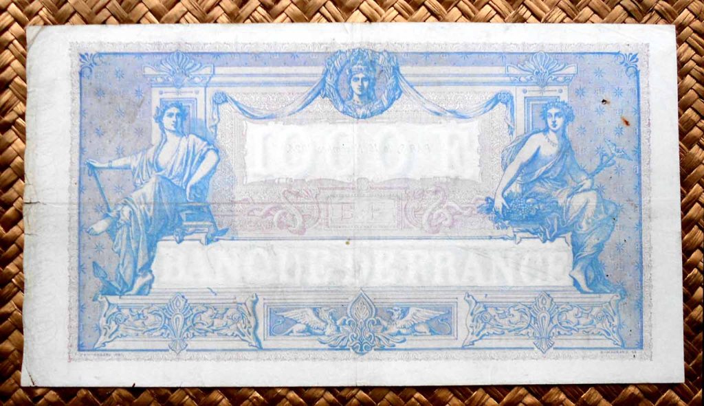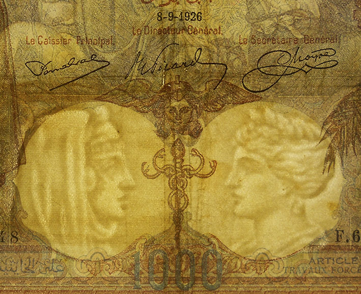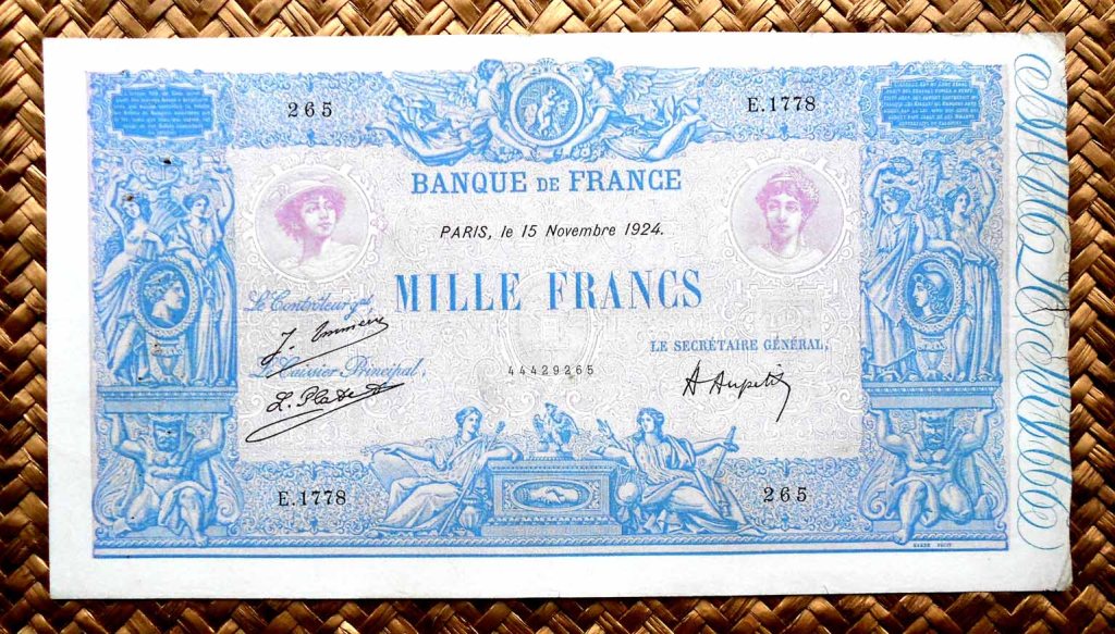 El billete de 1000 francos de 1924, obra de los artistas Jacques Jean Barre y Camile Chazal y de los grabadores Jules Robert y Maurant, lleva las firmas de J. Emmery como controler general, L. Platet como cajero principal y de A. Aupetit como secretario general.