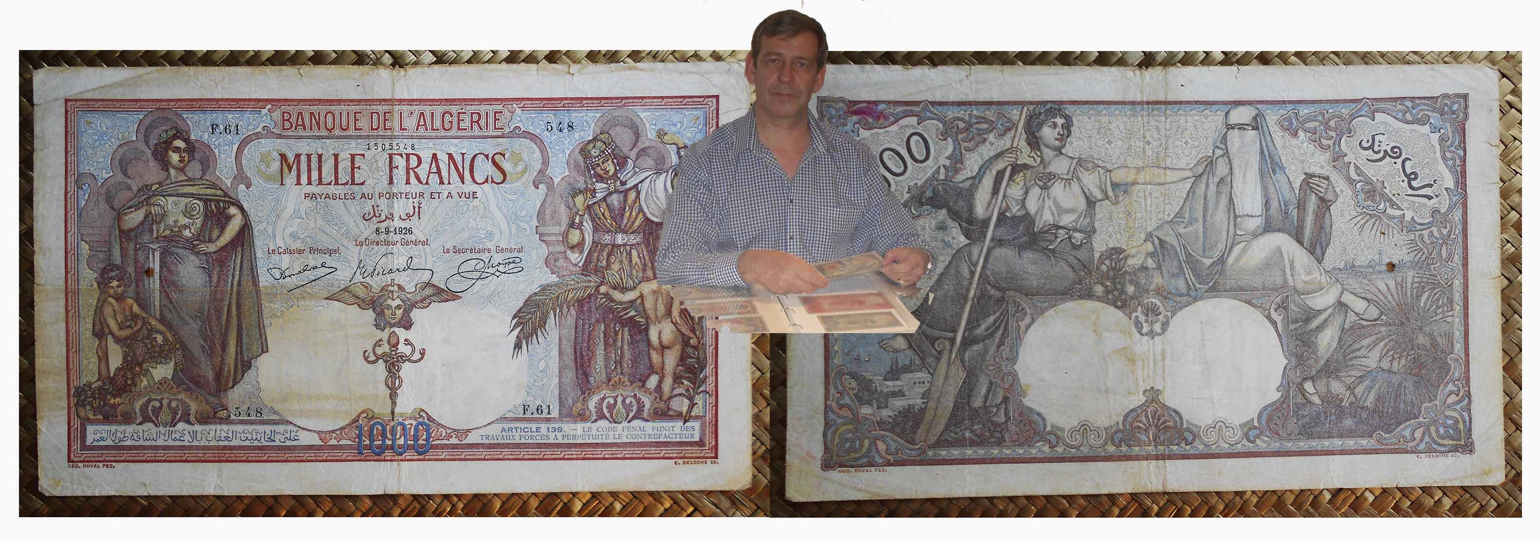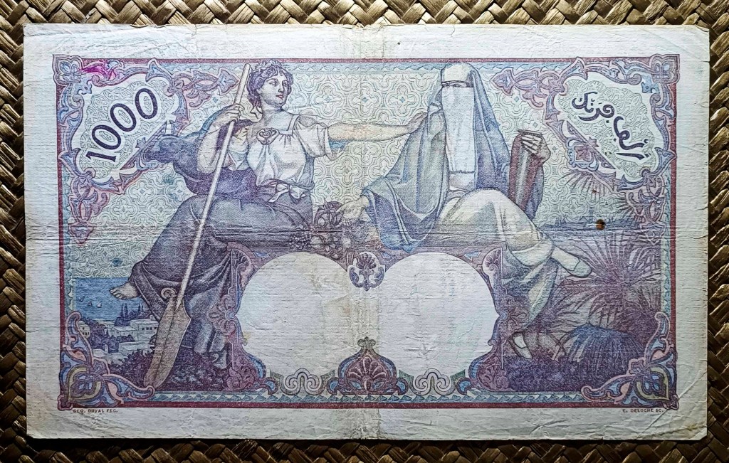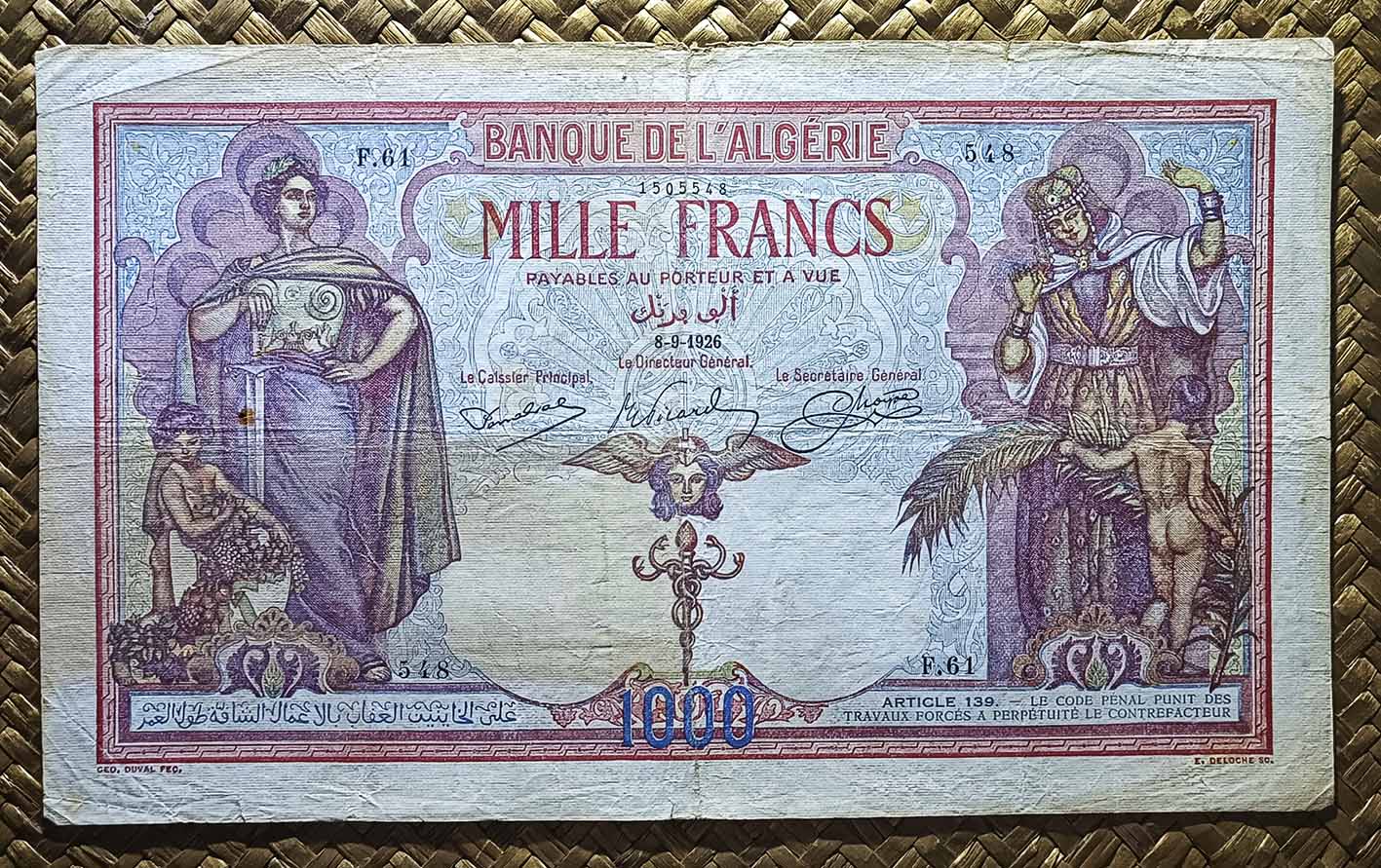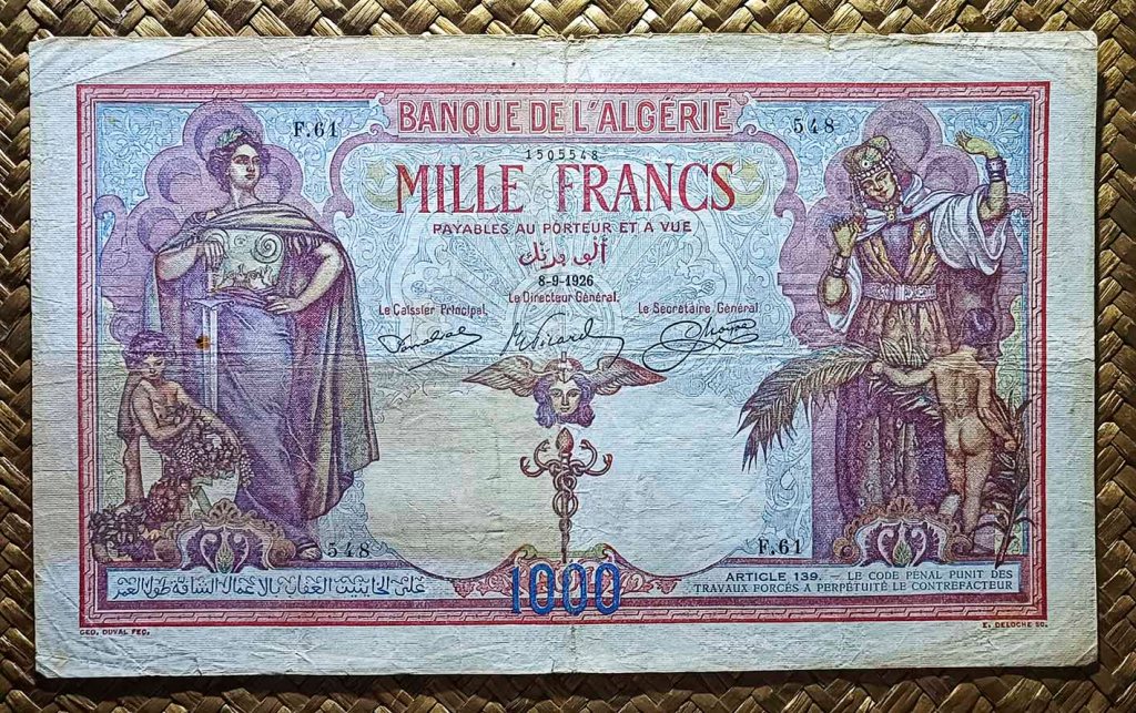 Los 1000 francos de 1926 de Argelia, cuando este país era colonia francesa, deberían haber sido más un documento para enmarcar que algo que fuese utilizado como moneda de cambio, no solo por su belleza sino también por su tamaño; mide 245×145(mm).