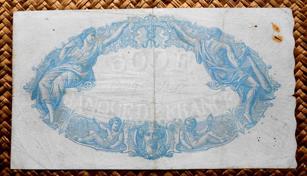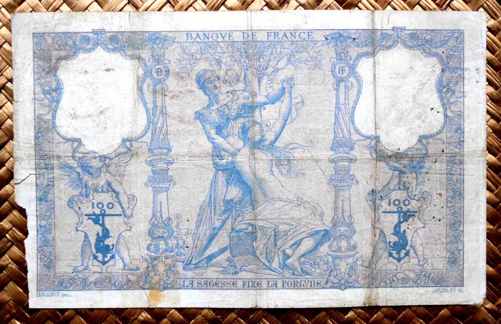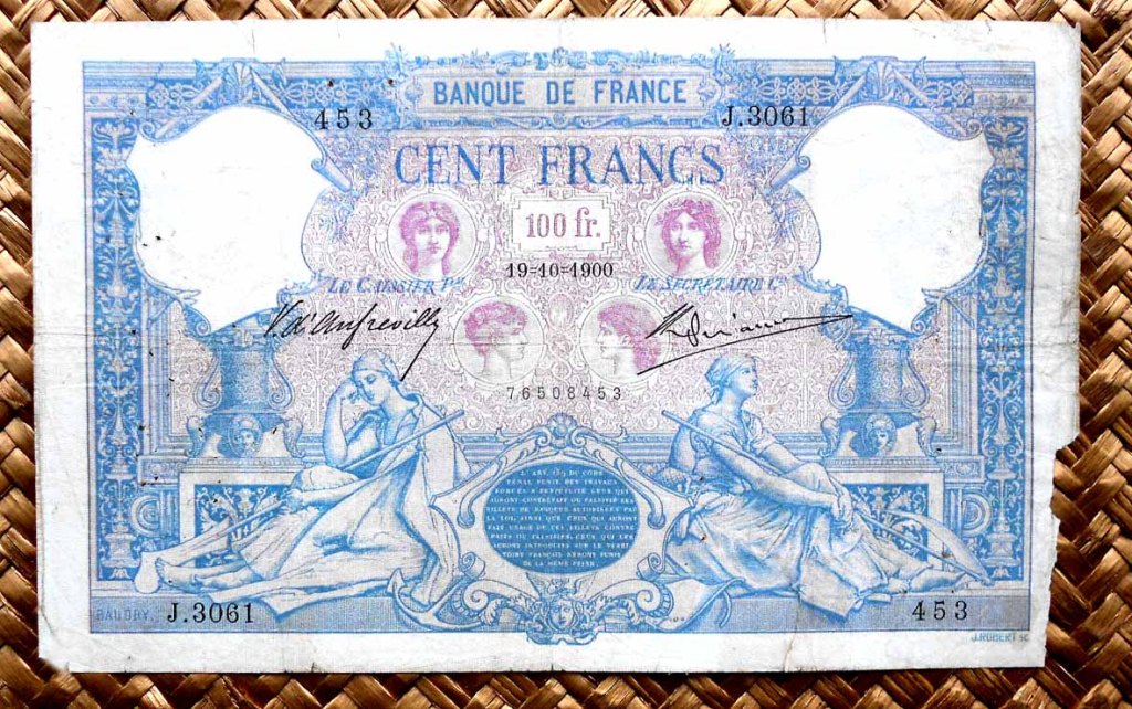 El billete de 100 francos de 1900, obra del artista Paul Baudri y el grabador Jules Robert, lleva las firmas de V. D’Anfreville como cajero principal y de Giraud como secretario general.