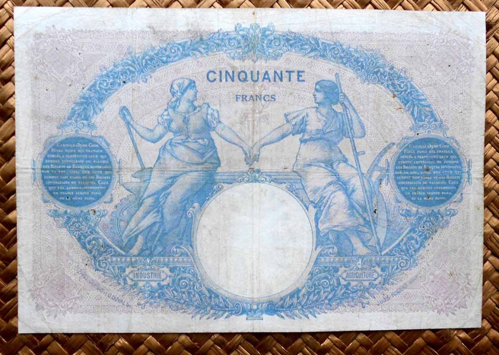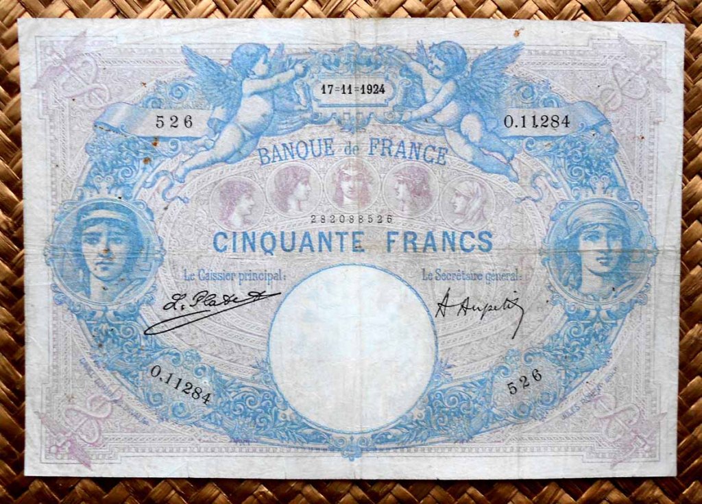 El billete de 50 francos de 1924, obra de los artistas Daniel Dupuis y George Duval y del grabador Jules Robert, lleva las firmas de L. Platet como cajero principal y de A. Aupetit como secretario general.