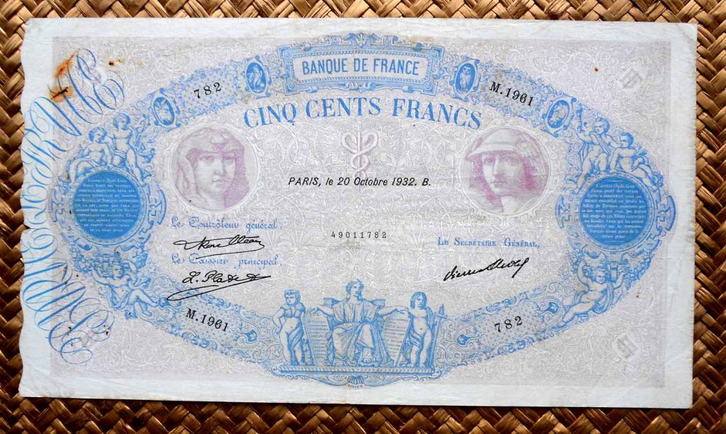 El billete de 500 francos de 1932, obra de los artistas Jacques Jean Barre, Daniel Dupuis, George Duval y Guillaume Cabasson y los grabadores Jules Robert, Dujardin y Adolphe Pannemaker, lleva las firmas de Roulleau como controler general, L. Platet como cajero principal y de P. Strohl como secretario general.