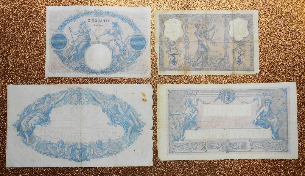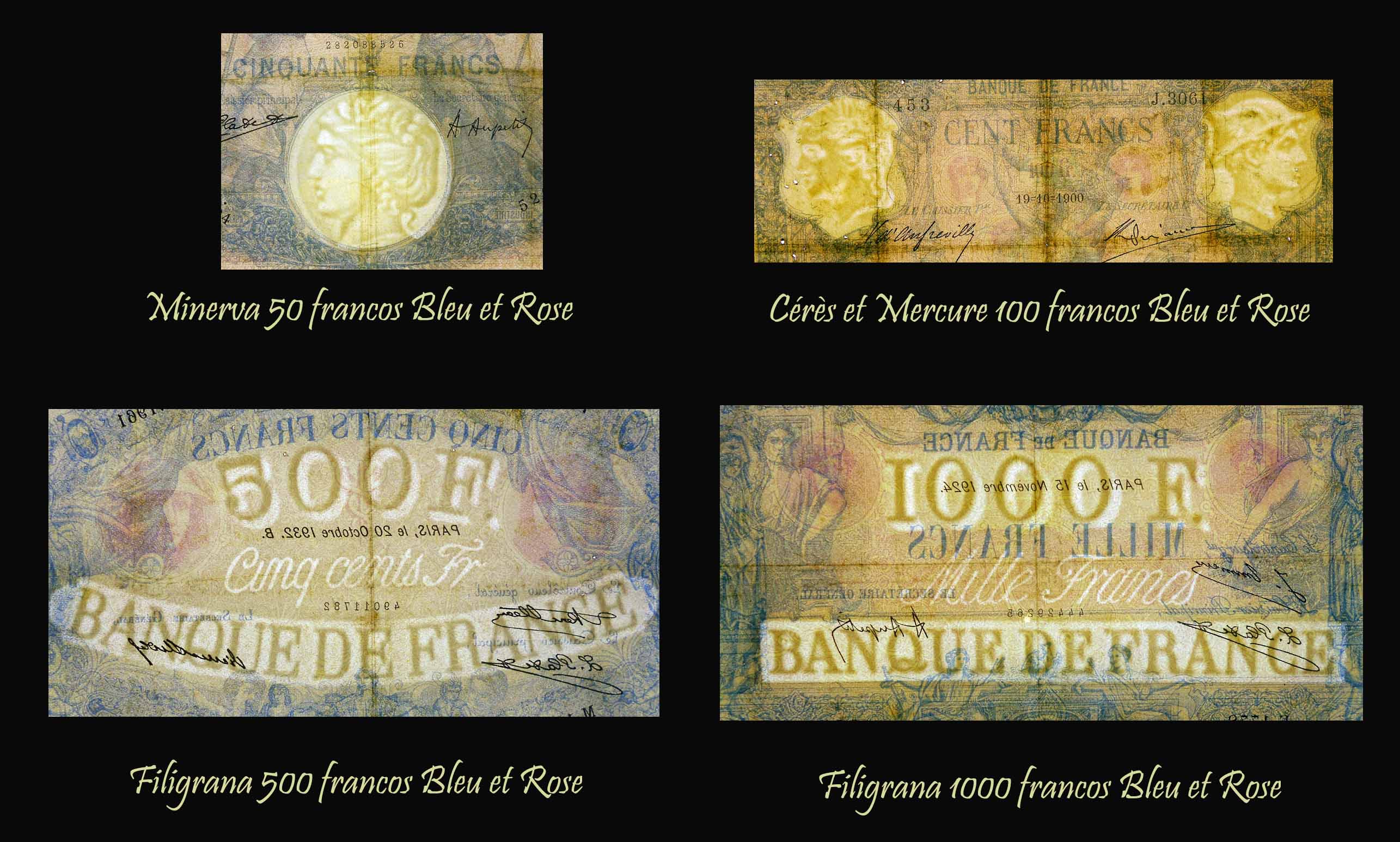 Sus marcas de agua (o filigranas) nos mostrarán el valor de cada billete (en número y en texto) y el nombre del banco “Banque de France” en mayúsculas sobre diferentes cartuchos de anversos o reversos en los de mayor valor (500 y 1000 fr.). Veremos representaciones mitológicas romanas (cabeza de Ceres, -diosa de la Agricultura, y cabeza de Mercurio,-dios del Comercio, en el de 100 fr. y cabeza de Minerva, -diosa de la Sabiduría y de la Guerra, en el de 50 fr.)