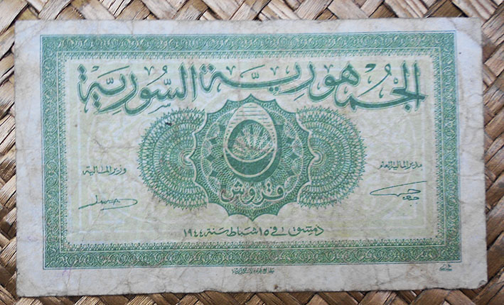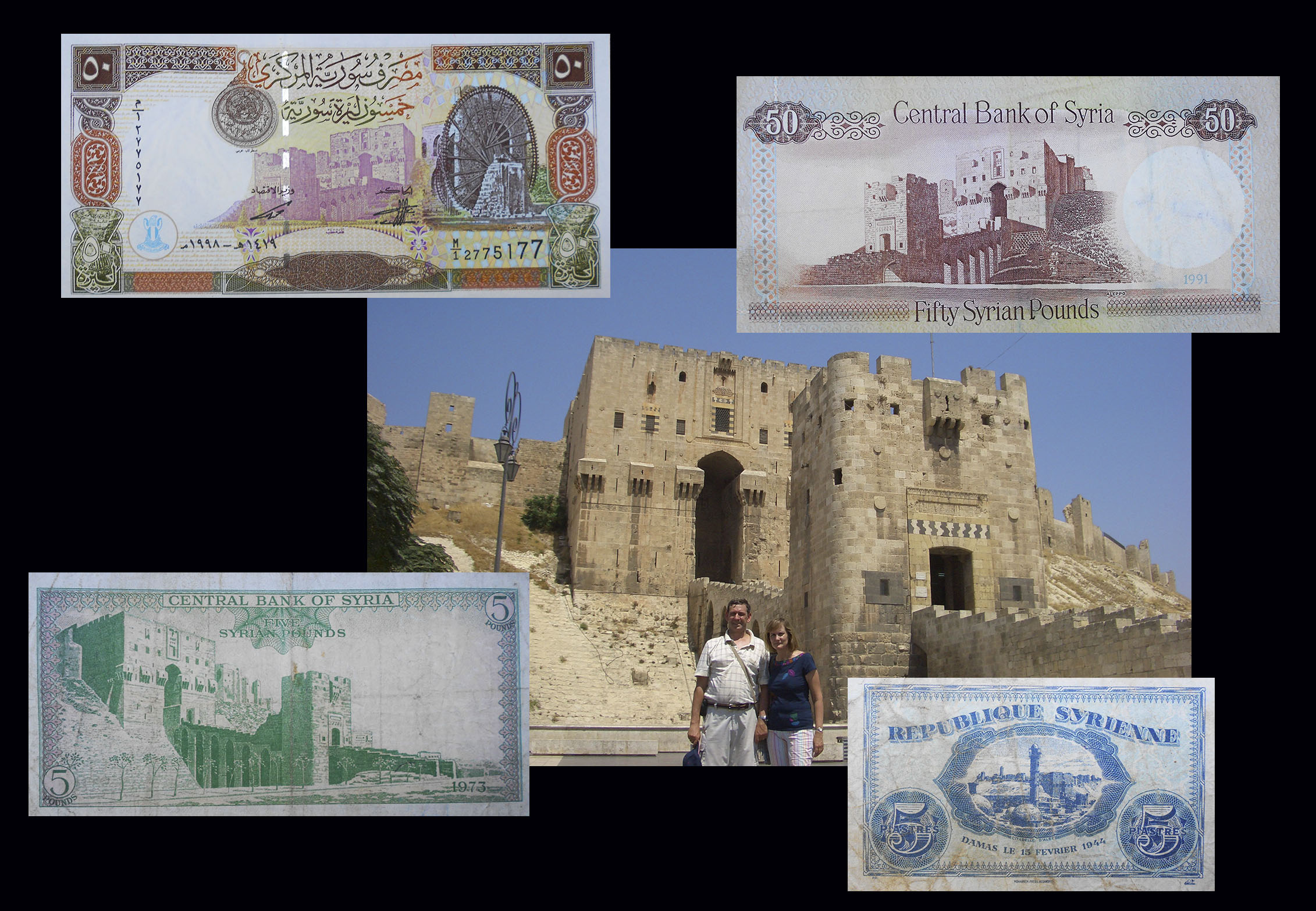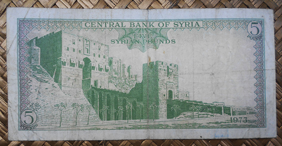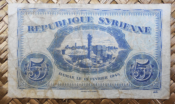 El billete de 5 piastras de Siria de 1944 nos ofrece en su reverso una vista de la Ciudadela en su conjunto, con la entrada con las dos torres y parte de la muralla fortificada. En su anverso un arabesco con el valor del billete en caracteres árabes.