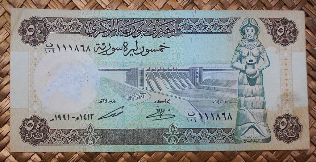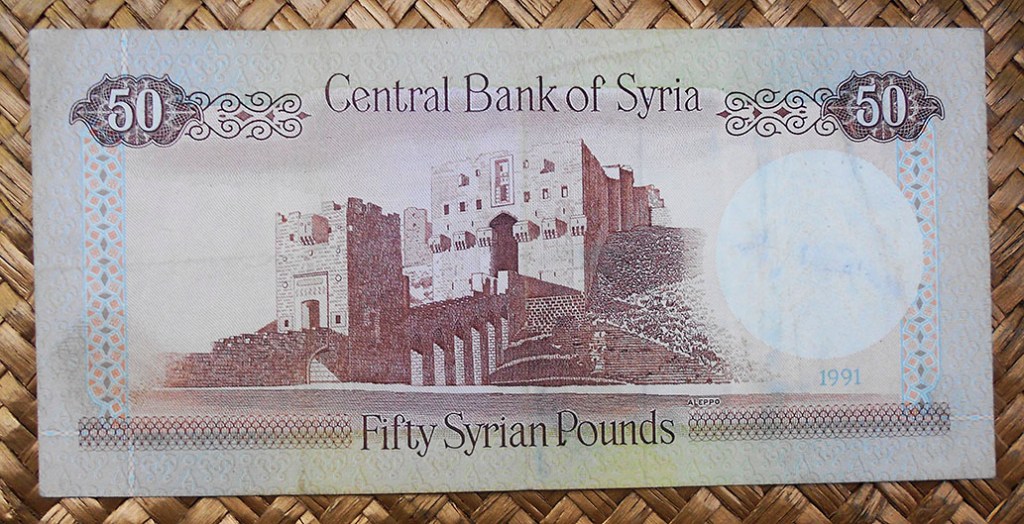 El billete de 50 libras de Siria de 1991 nos muestra en su reverso la misma vista de la Ciudadela que el anterior, pero tomada desde el lado opuesto. En su anverso una presa sobre el río Éufrates y una estatua de la diosa del agua Mari, de la Dinastía arcaica ( s. XX a.C), expuesta (¿?) en el Museo de Aleppo.