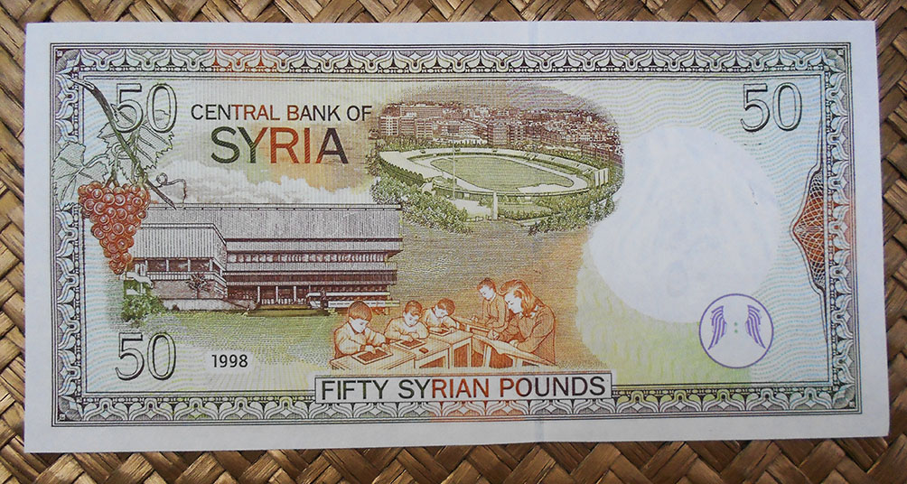 El billete de 50 libras de Siria de 1998 nos ofrece esta misma vista anterior de la Ciudadela, acompañada de un grabado de norias (típicas de la ciudad de Hama). Su reverso nos muestra la cotidianedad de la vida siria con un grupo de estudiantes, el edificio de la Biblioteca Nacional Al-Assad y el estadio de futbol Abbasiyyin de Damasco.