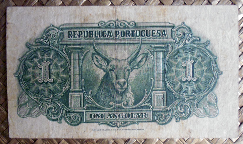 En los reversos se muestra la cabeza de un antílope entre dos columnas clásicas y a sus lados sendas rosetas con el valor del billete, rodeadas de hojas de acanto. Sus capiteles soportan una cornisa con el texto “REPÚBLICA PORTUGUESA”. Al pie una cartela con el valor “UM ANGOLAR” y bajo ella la identidad de la empresa editora “Thomas de La Rue & Coy Ltd Londres Inglaterra” .